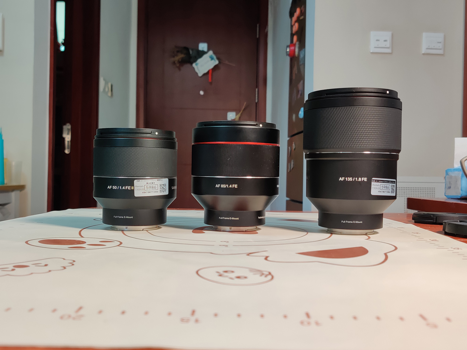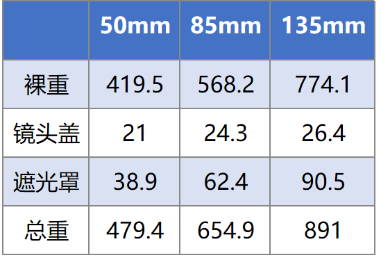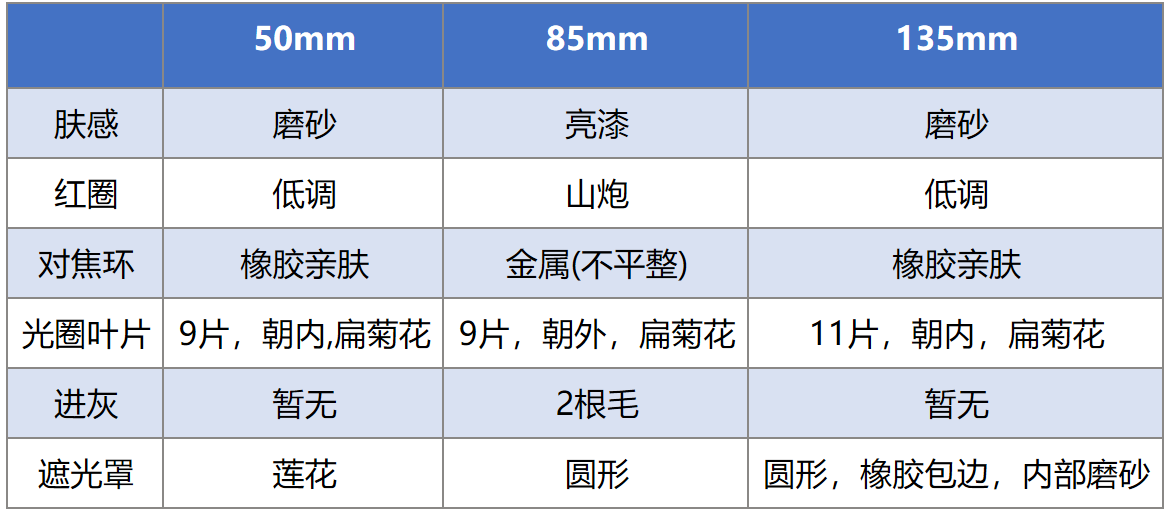 说下直观感受:50有塑料感,又轻又小,85有金属感略沉手,因为镜头比较短粗,因此手感比相同重量的2875一代(550g, 瘦长)手感要好。135体积大,但没有看起来这么重