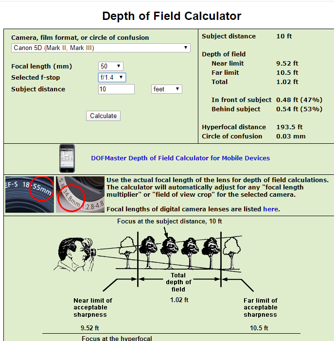 景深距离计算器,描述的是焦点前后清晰的范围(即景深)有多长,大光圈时近对焦时容易获得“浅景深”