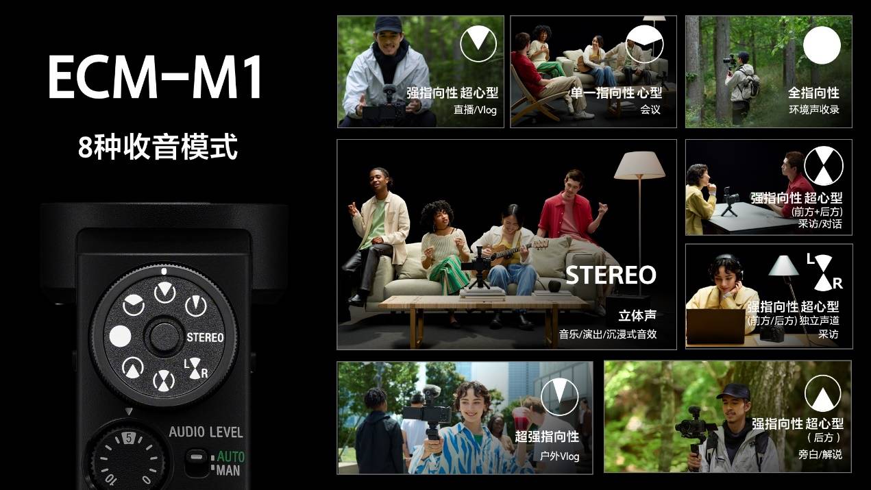 随着Vlog和社交媒体的蓬勃发展,大家对视频音质的期待越来越高,希望麦克风的适配场景越来越丰富。ECM-M1结合了索尼数字音频麦克风无需插线、无需充电、收音清晰等特点之外,更凭借索尼先进的波束成形技术,精准调控多个麦克风单元的灵敏度,在业界首次推出支持8种收音模式的高效录音解决方案。用户通过带有锁定按钮的模式旋钮,可根据需要选择匹配的收音模式: