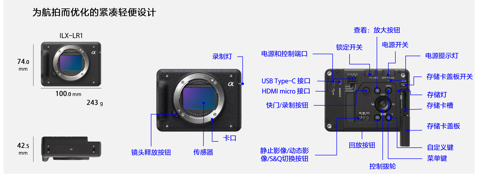 ILX-LR1是一款体积小巧、轻量化设计的全画幅可扩展系统遥控相机,它的尺寸约为 100mm宽 x 74mm高 x 42.5mm深,重约 243克(本机无显示器、取景器和电池),为满足工业应用所需设计。