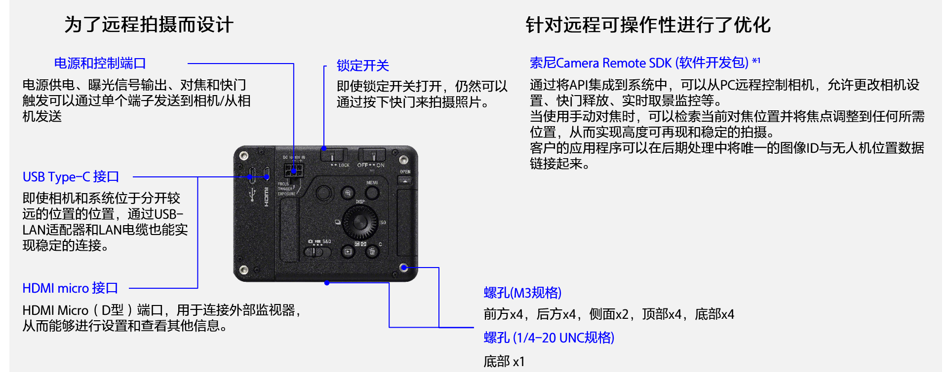 索尼Camera Remote SDK使用户可以远程通过应用程序访问,控制相机的菜单以及其他功能。通过将API集成到系统中,可以让用户从系统远程遥控相机,实现更改相机设置、释放快门、实时取景监控等功能。此外,用户的应用程序可以在后期处理中将唯一的影像ID与无人机位置数据链接起来,可以使用模拟信号触发拍摄影像,大幅减少每张影像和无人机位置数据之间的延迟。借助新的1.11版本SDK,当使用手动对焦时,可以检索焦点并将其调整到所需位置,从而实现高度可重复和稳定地拍摄。此外,锁定开关还可防止背面按钮造成的意外错误操作。