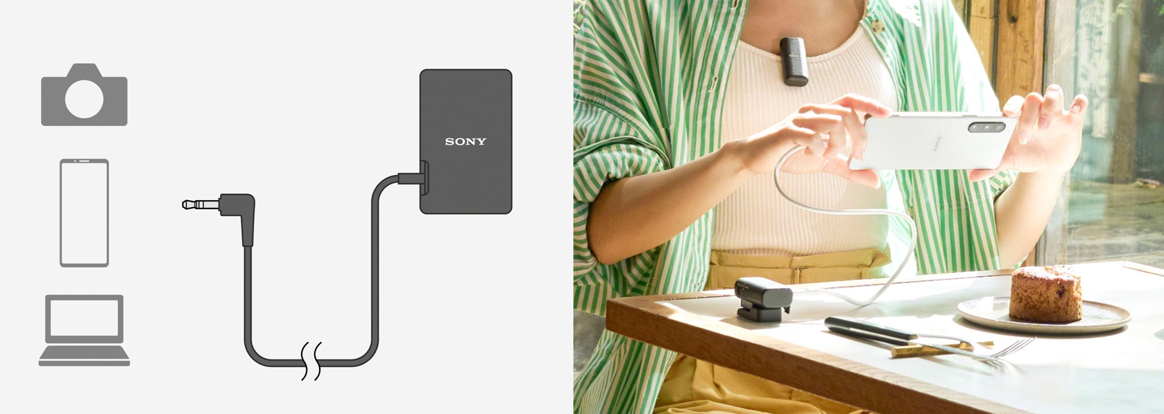 ECM-S1麦克风的接收器可与支持Mi热靴接口的索尼相机连接,并可通过麦克风及接收器上的USB Type-C®接口,直接输出数字音频信号(48kHz/24bit),进行高音质的收音。而且,无线的连接方式可实现简洁的桌面布置,例如通过接收器的USB接口将麦克风无线连接到电脑或智能手机,或者通过麦克风的USB输出接口直联。此外,接收器提供一个3.5mm接口(立体声)可用于音频输出。