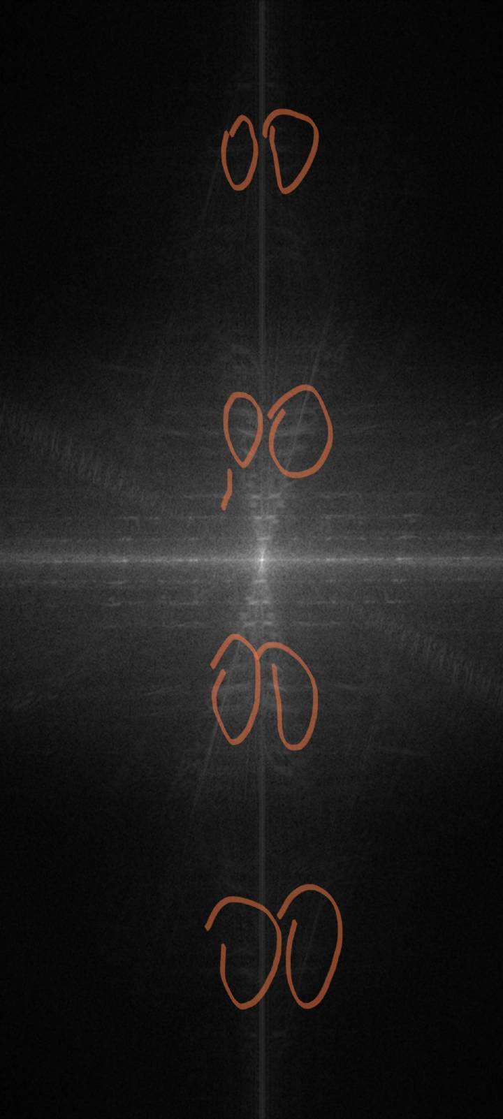 最后突然发现8老师没提欠采样混叠我也顺着没讲,实际上粗略判断是否由于像素太低/跳行采样导致高频混叠入低频的方法也很简单,看看有没有在高频区和低频区重复出现,而且有对称性的特征形状就行了(注意高低频是关于原点中心对称的,那些穿过y轴的横纹图样显然不算),比如这张图里这个类似阿拉伯数字“3”的图形。不过人眼看总归不太准,跑一下SFR的话结论会明确一些。”
