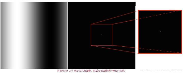 方向水平向右的单频正弦波图像,做二维FFT之后结果是(0,0)和(1,0)处各有一个白点,代表图像只有基频分量,同时基频分量的方向向右。
