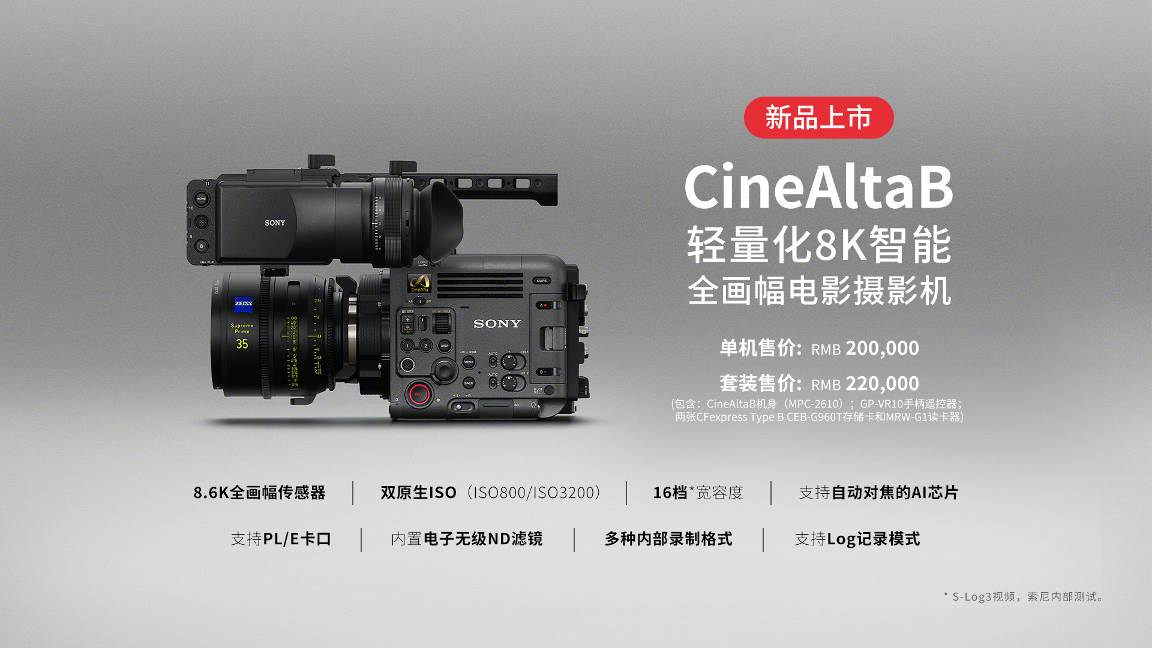 2024年1月19日,索尼全画幅8K电影摄影机 CineAltaB正式上市,单机官方售价人民币20万元;CineAltaB机身包括手柄、两张CFexpress Type B CEB-G960T存储卡和读卡器套装售价为人民币22万元。