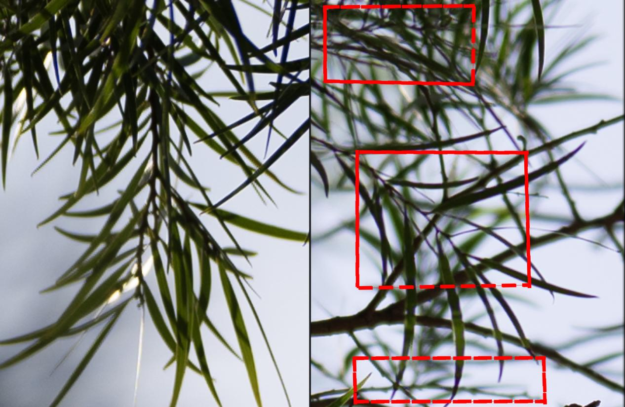 以上是采用最小光圈f/16拍摄的对比图,我们再放大观察下远端的虚化效果。