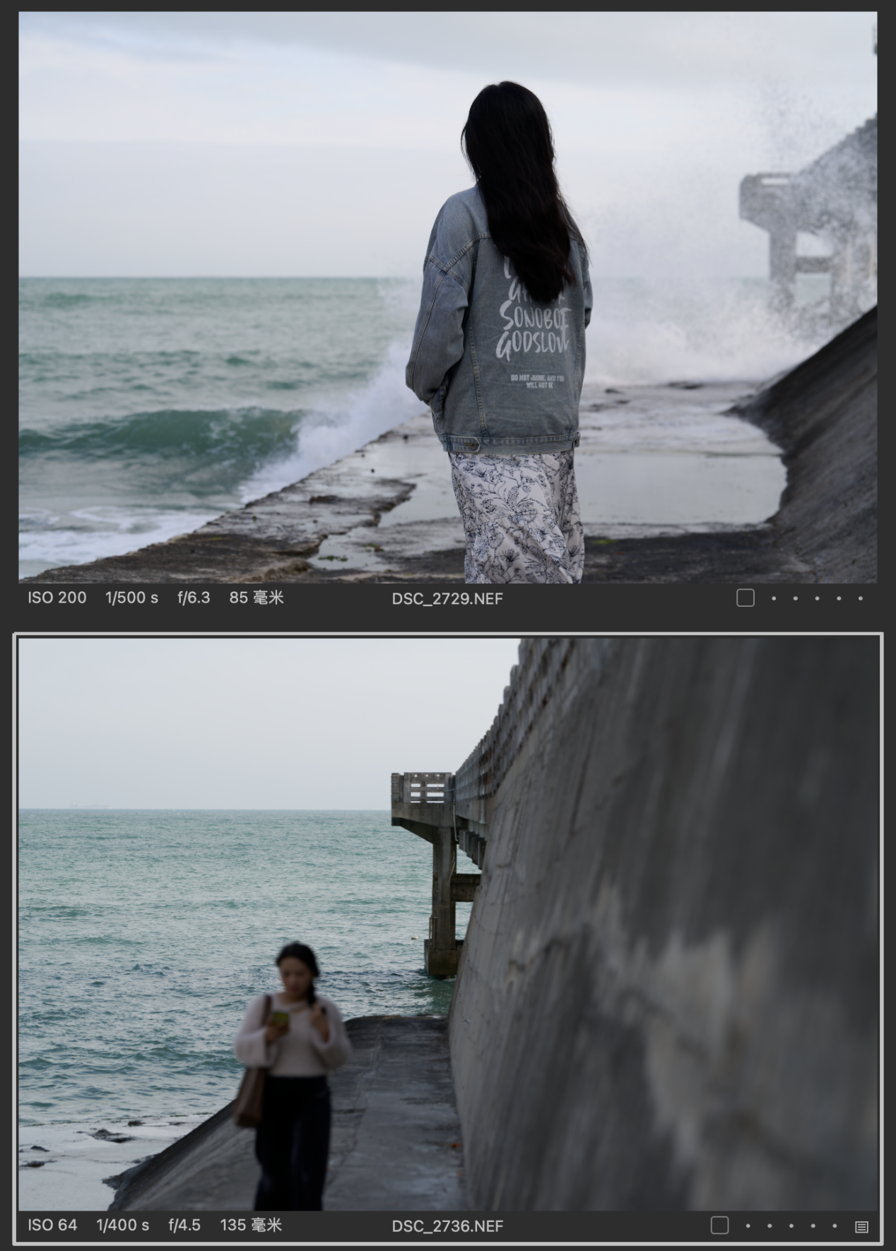 (为了更贴合大部分影友拍摄的实际情况,模特身高在1.6m-1.8m普遍适用以下参考数据,对比图的排列都是以图一为Z 85mmf/1.2 S镜头拍摄,图二为Z 135mm f/1.8 S Plena镜头拍摄的顺序,且图下有参数标识)