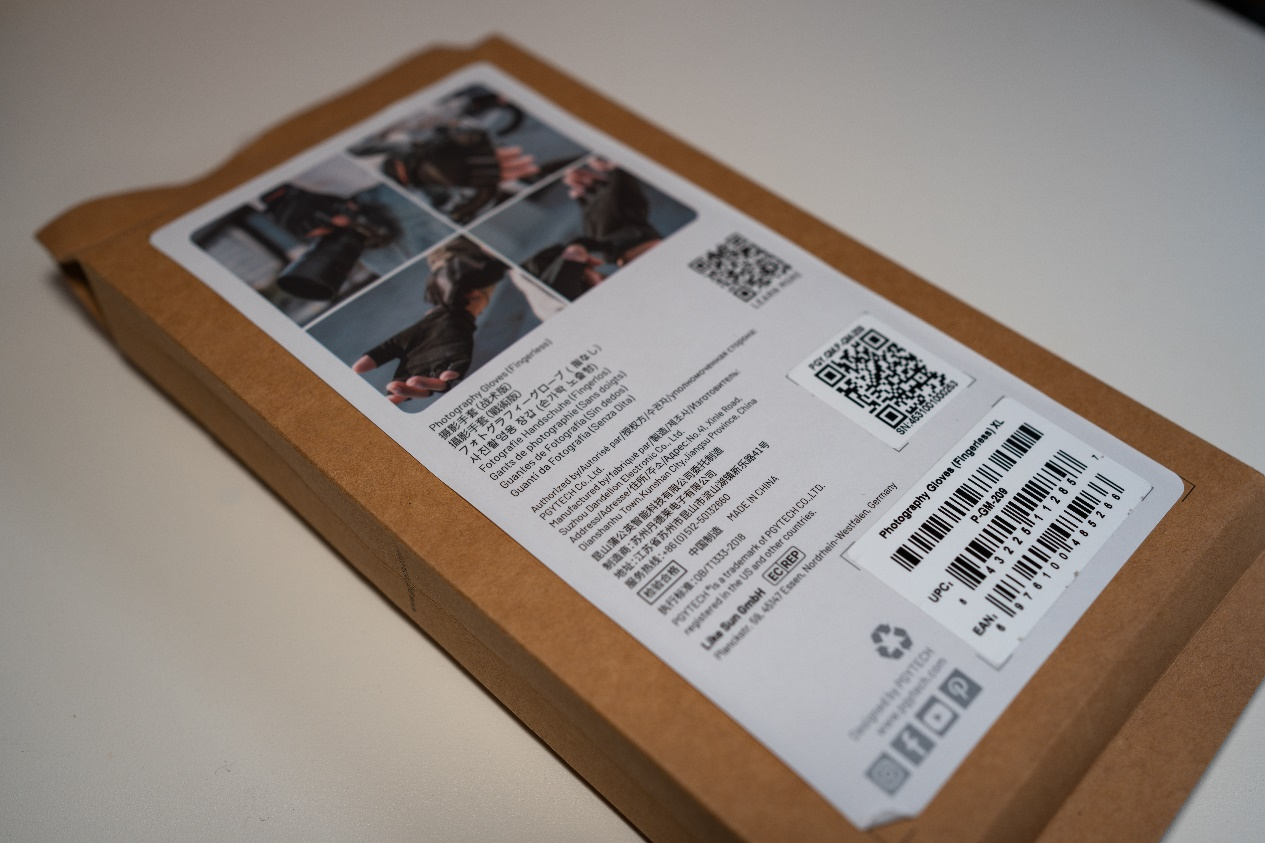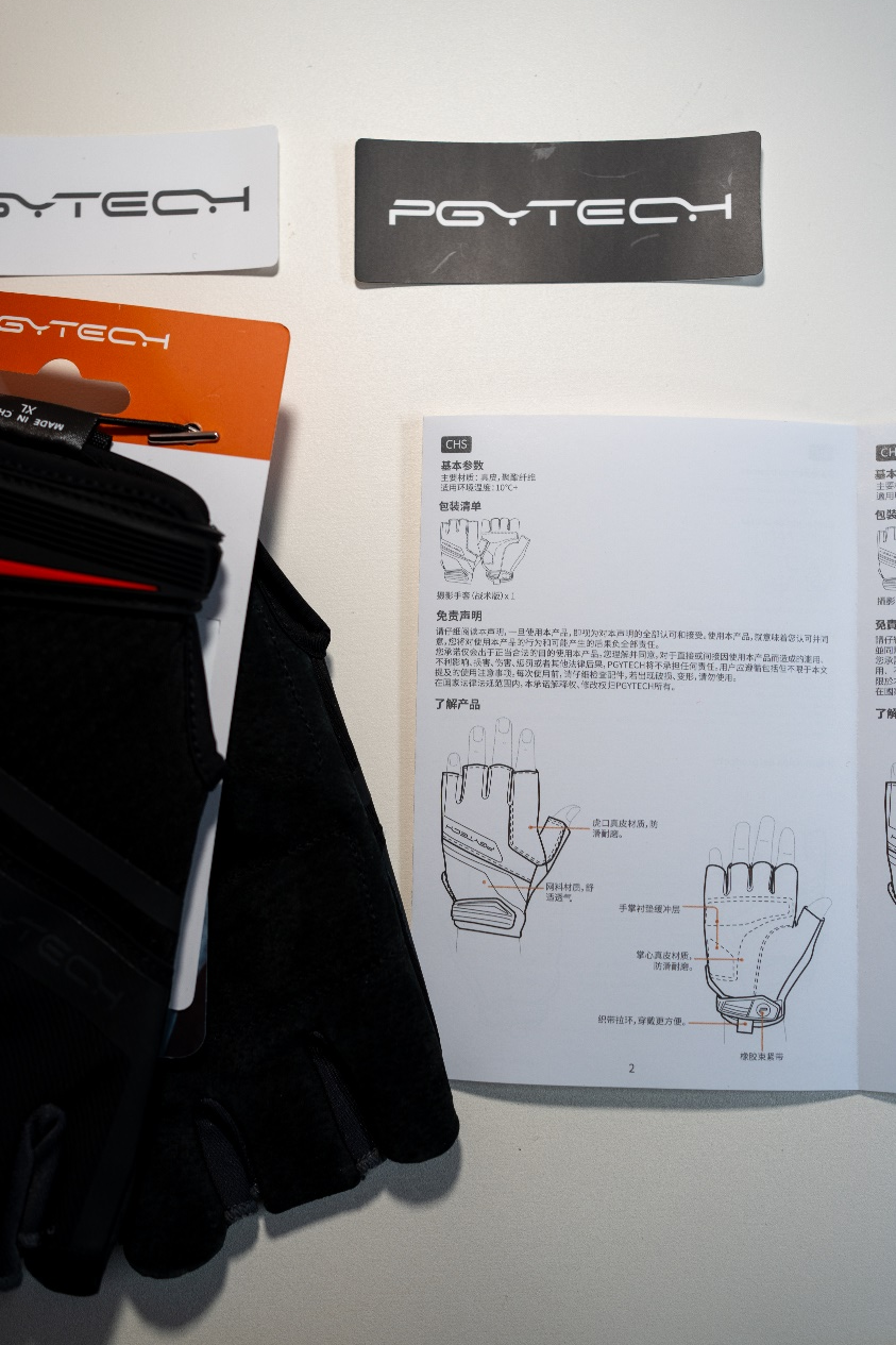 拆开牛皮纸内包装,内部为手套本体、产品标签,黑白两张PGYTECH的贴纸以及说明书(SN二维码涂抹)。