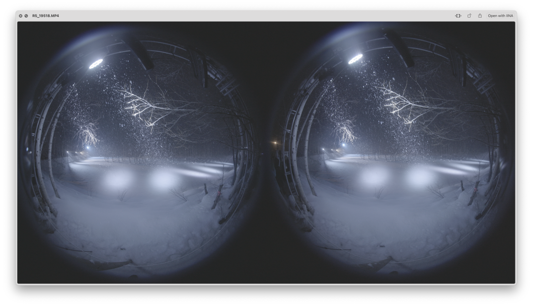 在后期制作时,对于鱼眼到equirectangular投影的转换和双眼画面的对齐通常是比较麻烦的事情。即便是比较小的视差错误,在头显中观看都会使人难受,产生3D眩晕。使用同一支镜头得到有视差的两个画面已经简易了后期的流程。但由于每只镜头仍会存在差异,以及存在对焦等诸多因素的共同作用,仍然无法通过一个固定参数得到变换后的画面。这次的成片中使用了较多的片段,经过实践对片段的检查,各种环境下拍摄的所有片段佳能提供的EOS VR Utility软件经过自动计算输出的VR180 SBS的视频,都是垂直方向无视差,水平方向越近的物体视差越大,在头显中观看没有明显的视差的不适感。配套的软件极大地简化了后期的流程。