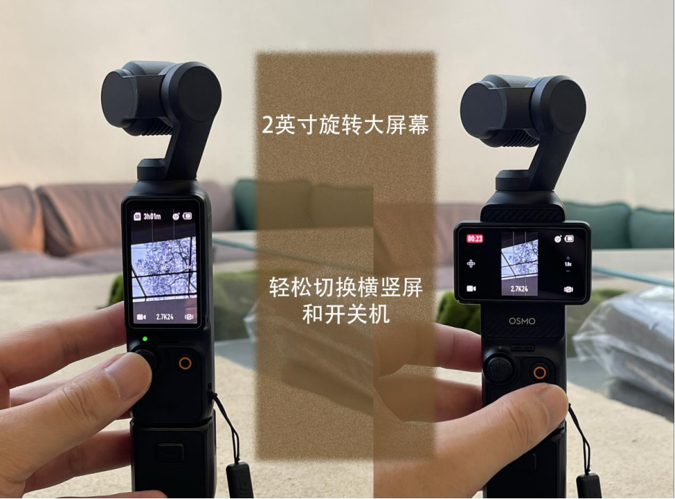 大疆Osmo Pocket 3和上一代相比最大的差异就是这块屏幕设计,它采用了2英寸OLED屏幕设计,支持100% P3广色域显示。这块屏幕除了可以触控之外,还能够旋转,我们可以通过旋转屏幕来控制口袋云台相机开关机。关闭后自动轴锁模式起作用,云台电机自动运行到收纳位,也可以手动锁定云台。切换横竖拍的时候,操作界面也会跟随着智能切换。