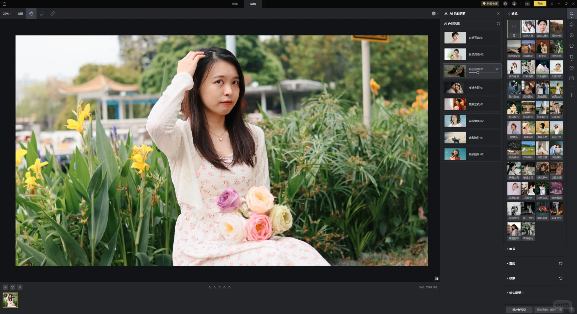 1. 首先第一栏就是调色界面,这里提供了AI色彩调节、AI色彩风格以及众多可供选择滤镜,整体用下来相当可行,还可以调节调色的轻重程度,这个功能很人性化了,再结合调色界面进行微调,那是嘎嘎出片啊。