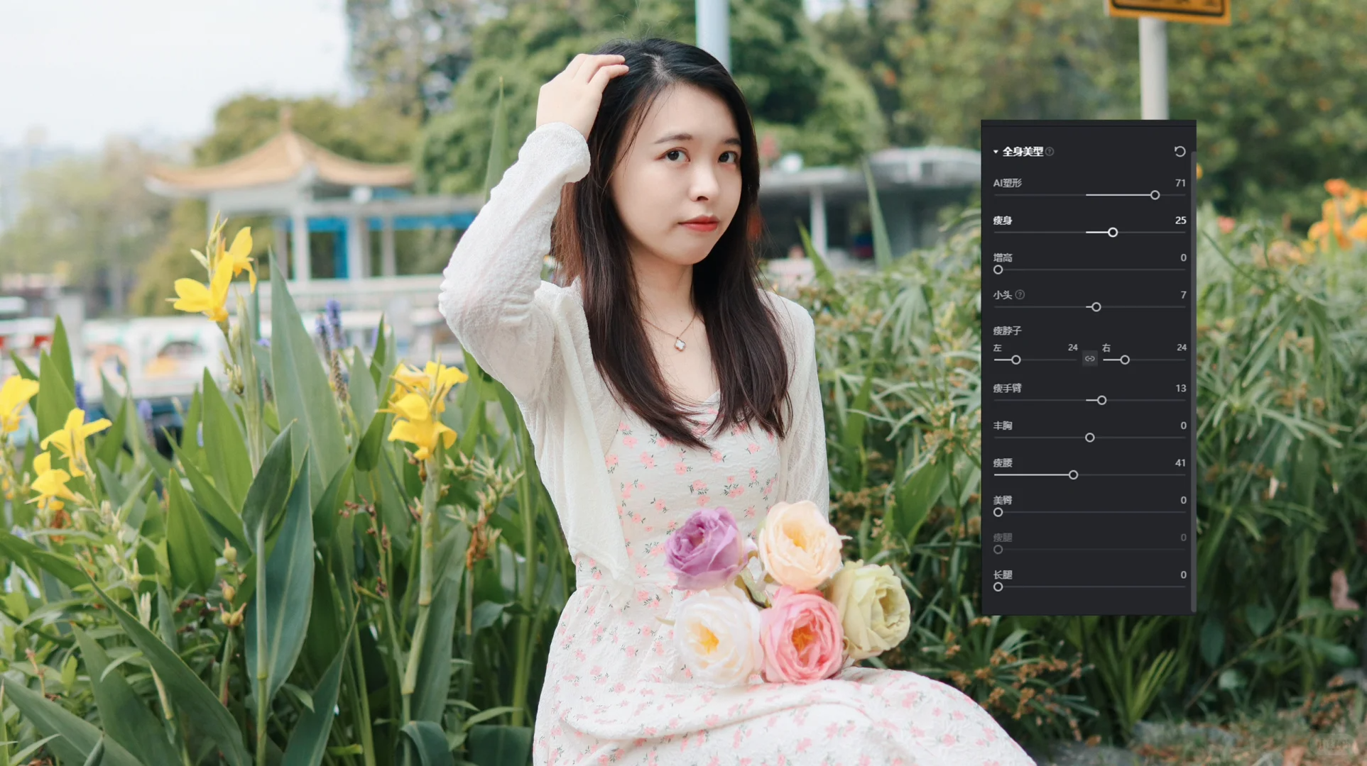 4. 除了瘦脸美白以外,当然还少不了他的AI塑形,这里可以调整四肢瘦身、美腿、瘦腰胳膊、小头,处理过渡的很自然,识别很精准,不会说处理后出现歪腿歪头情况,也很好的控制了主体与周围环境的变形扭曲发生,值得点赞。