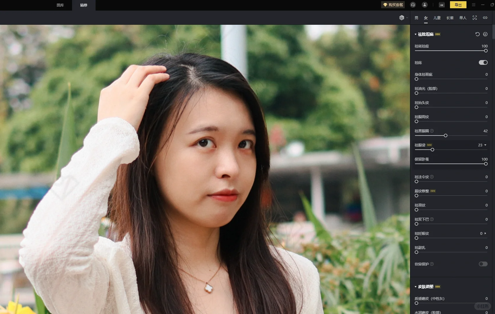 2. 接着就是人像美化部分,这里包含了人脸五官瑕疵该需要调整的功能都有了,祛痘、祛眼袋这些应有尽有,其中皮肤方面的质感磨皮很是惊喜,在不影响原来皮肤质感的同时也很好的进行了磨皮,还可以一键选择哑光、水光肤感,真的很省心。