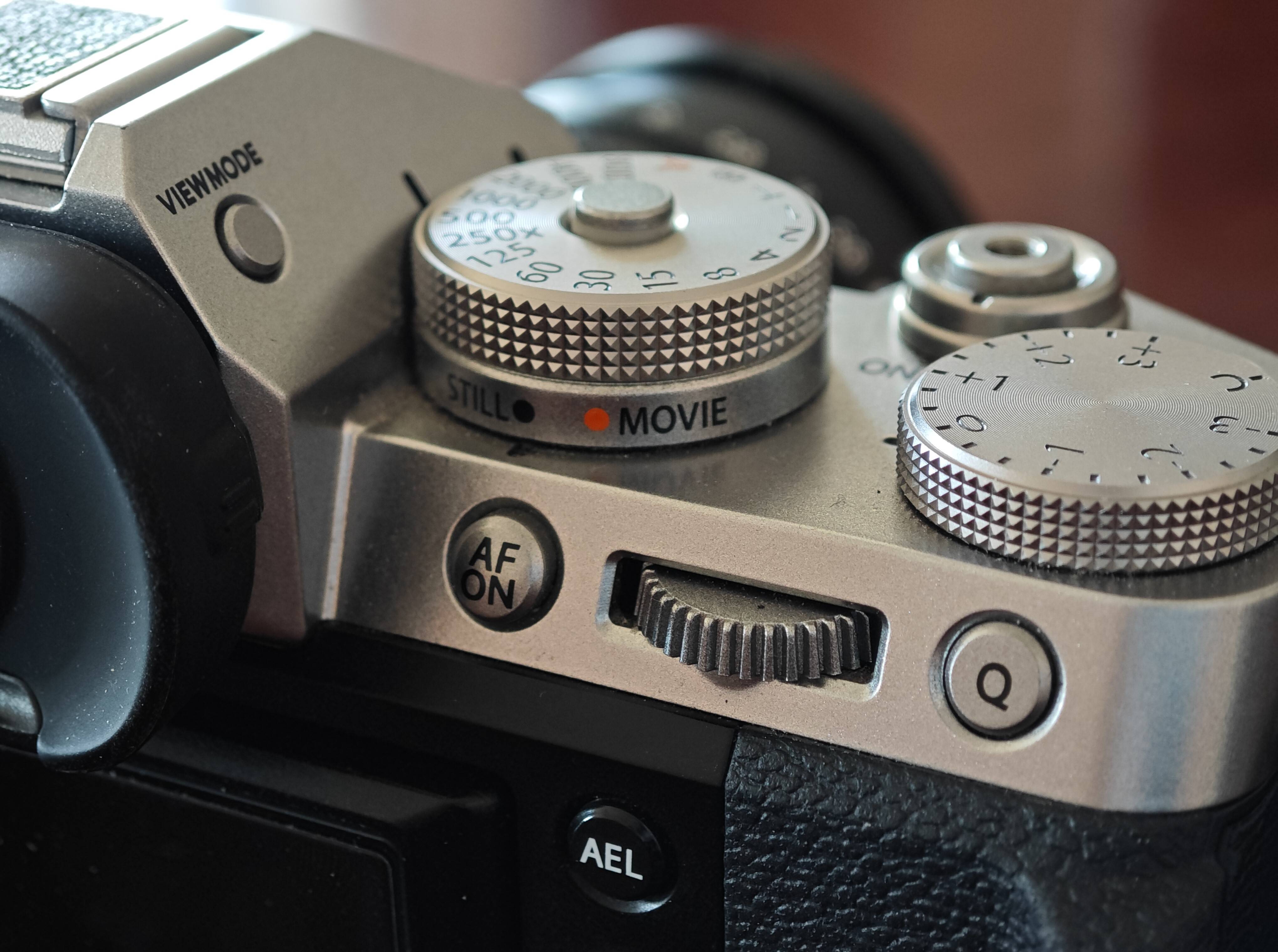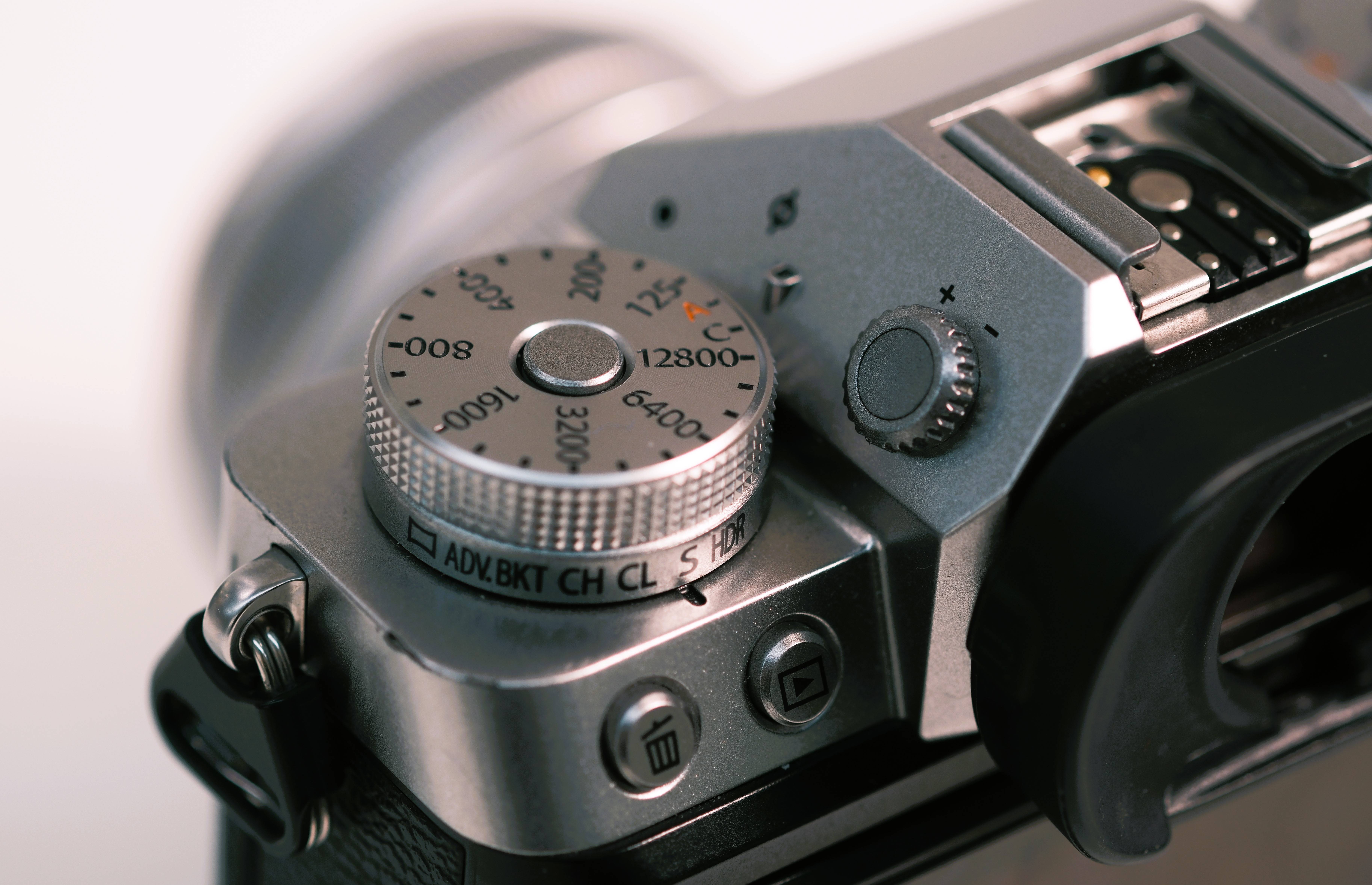 XT系列复古机身引以为傲的实体操作元素被大量移除,在XT机身上曝光三要素分别由两个机身转盘和镜头光圈环完成操作,xh2上摒弃了这种设计,曝光三要素被集成到一个转盘上通过不同模式的档位加以区分,机身保留了右边前后两个自定义波轮,可以快捷控制两项参数,iso则做成一个独立控制按键被放在快门旁边。