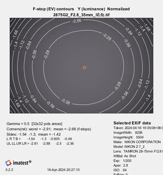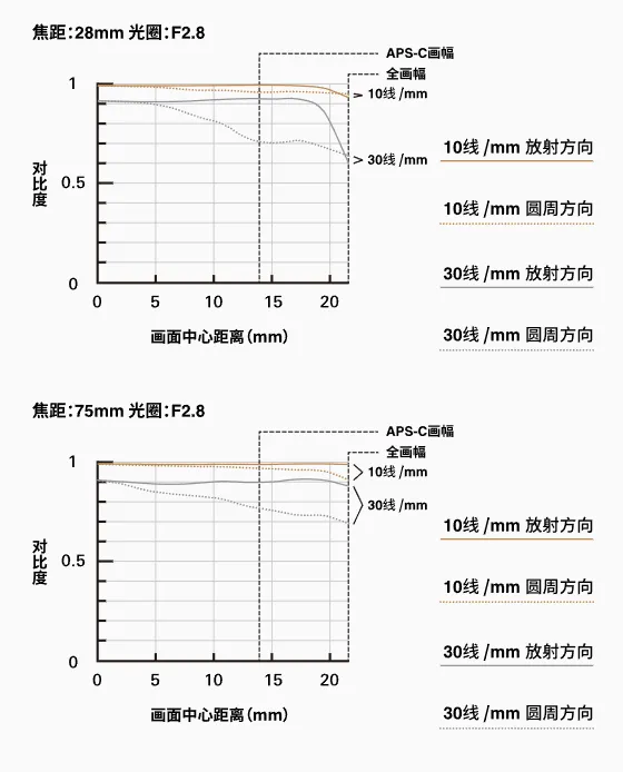 像场分辨率一致性方面。28到35mm的高分辨率部分还是以像场中心为主。在全开的工况下镜头从中心到边缘的画质减弱的趋势相对较小。