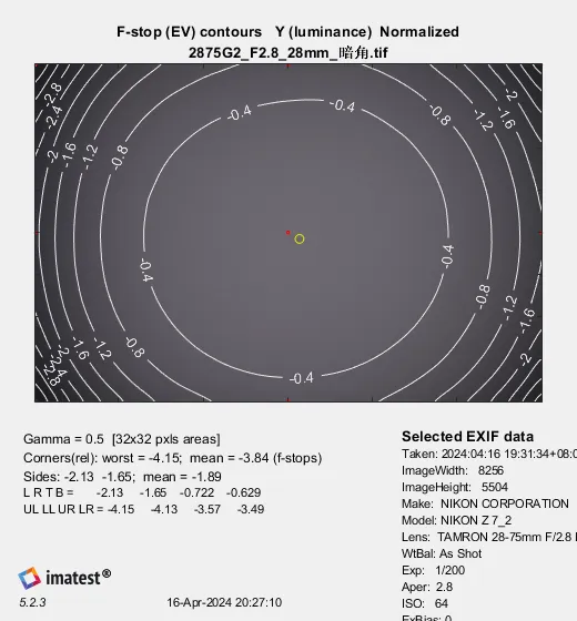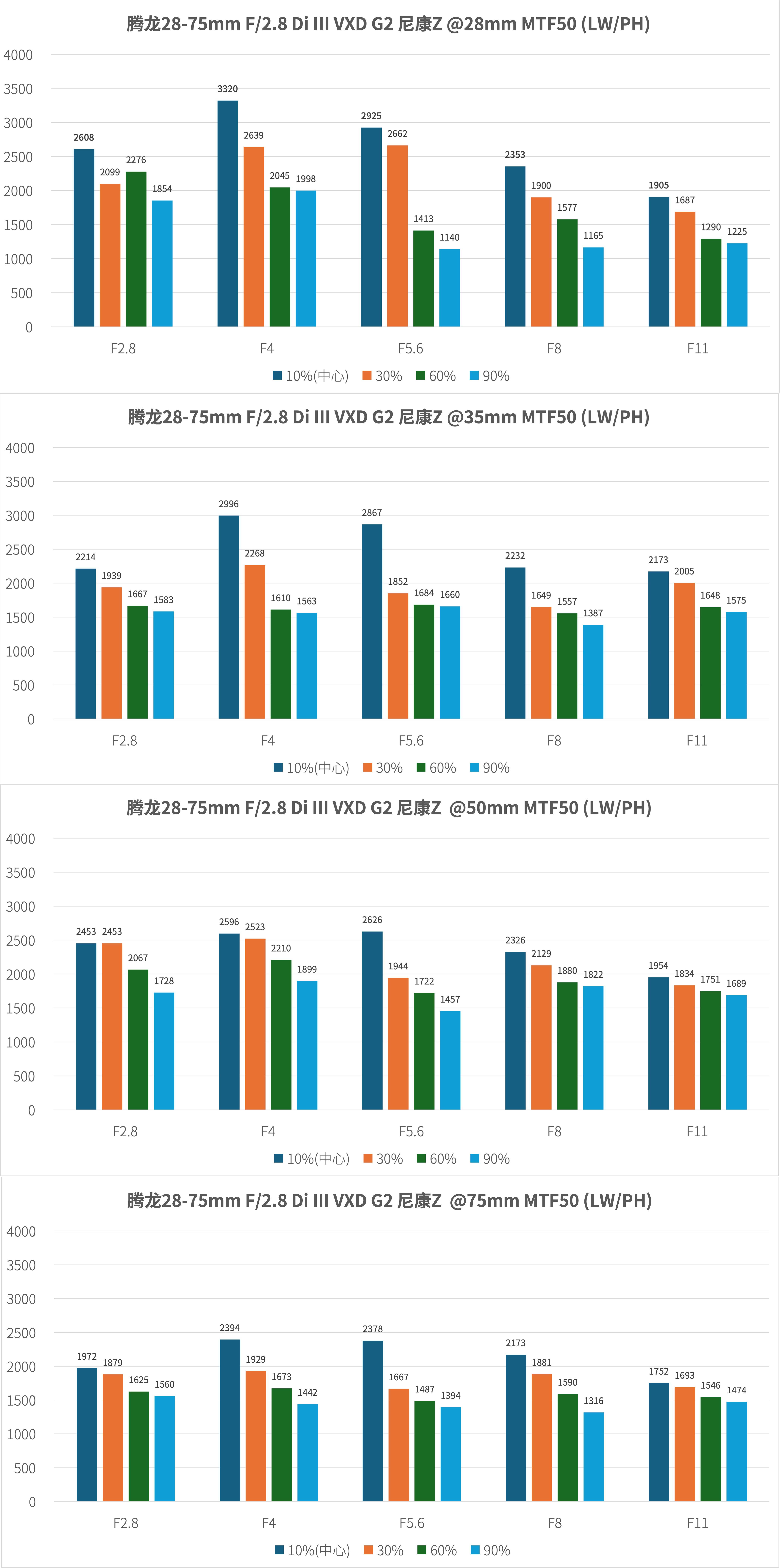 对比各焦段的分辨率,从 28mm 到 75mm 的分辨率逐渐降低,分辨率的峰值出现在广角端 28mm F4 的中心位置。