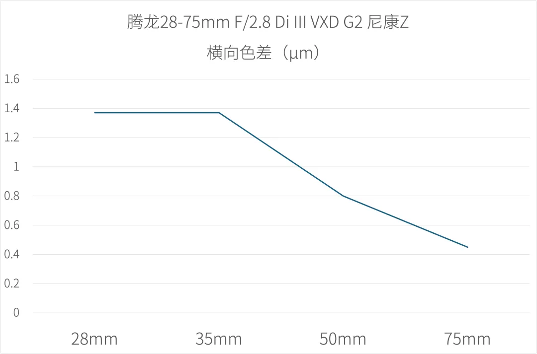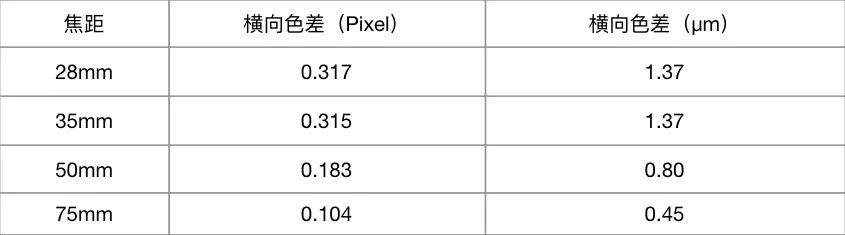 28-35mm端横向色差控制在了1.37μm,且随着焦段变长色差逐渐变小。实际使用时在高反差边缘对色差的感知也不明显,放大后才可见,使用后期工具消除即可。