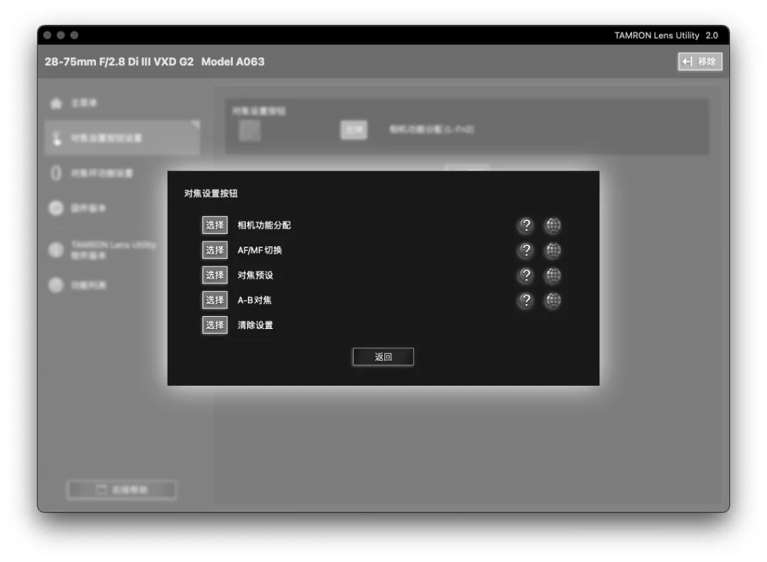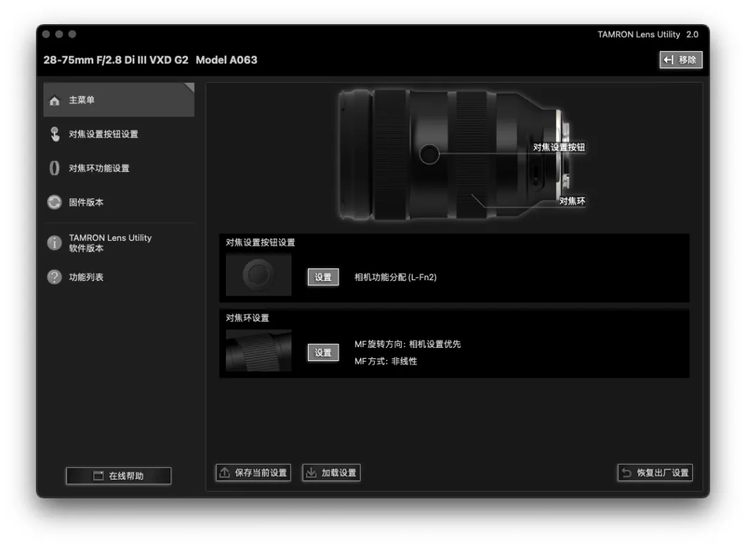 镜身上有一颗自定义按钮,可以使用电脑或手机端的 TAMRON Les Utility 软件配置这颗按钮的功能。