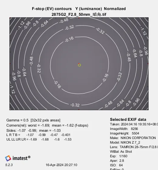 整体画质评价:实际使用时全开光圈即可,28-50mm的区间都有很好的分辨率表现。75mm端画质有所减弱,但是分辨率从像场中心到边缘的下降较缓,收缩光圈后可获得更好的中心分辨率。
