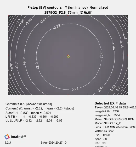 广角端28mm 到 35mm 的暗角会比较明显,需要使用配置文件或手动修正。在意暗角的状况下可收缩光圈拍摄。