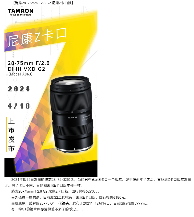 上新日期2024年04月23日——腾龙 28-75mm F2.8 Di III VXD G2 二代(A063)尼康Z口
