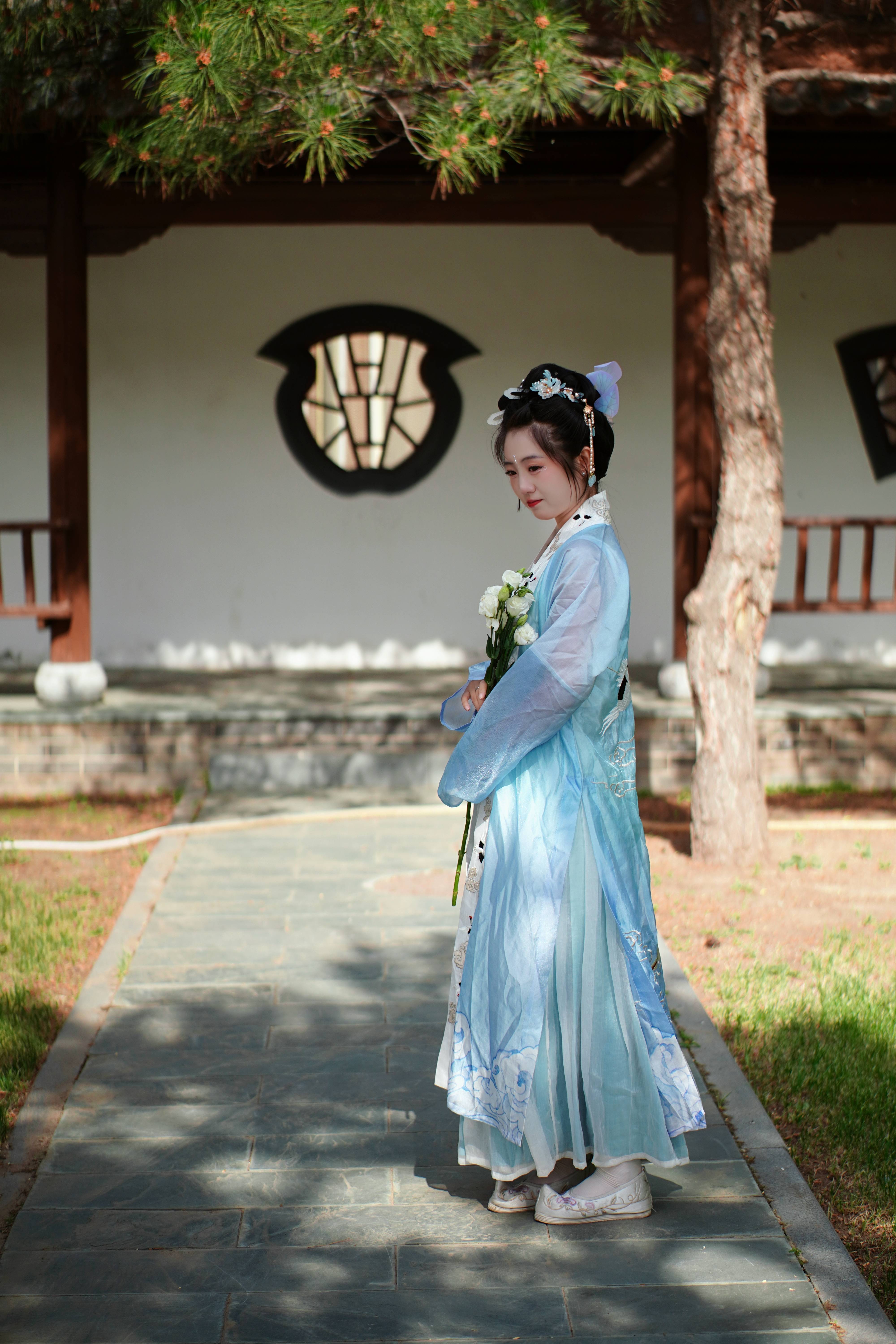 本次评测选择在内蒙古包头市阿尔丁植物园盆景园进行拍摄。模特身穿汉服,手持鲜花,在古色古香的园林背景下,展现出优雅动人的气质。