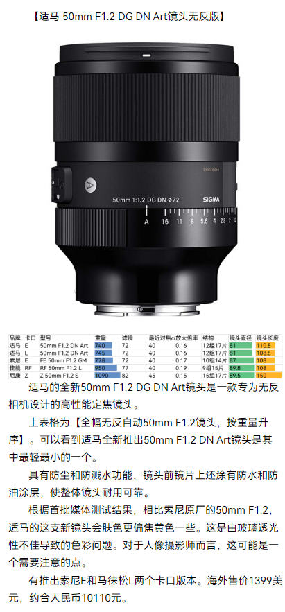 2、上新日期2024年06月07日——适马 50mm F1.2 DG DN Art 索尼FE口