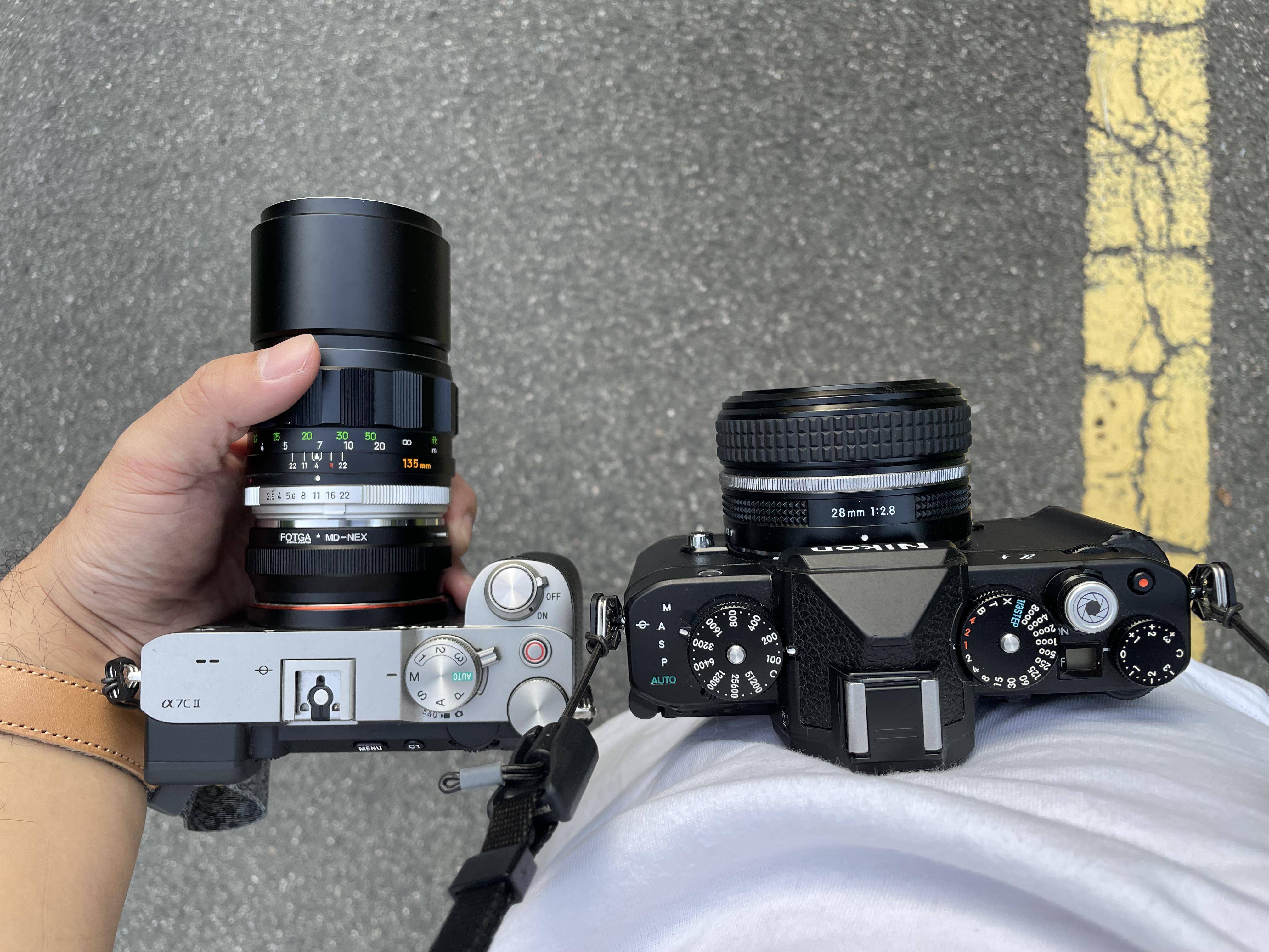搭配美能达135mm f/2.8转接的索尼a7c2和搭配28mm f/2.8的尼康Zf