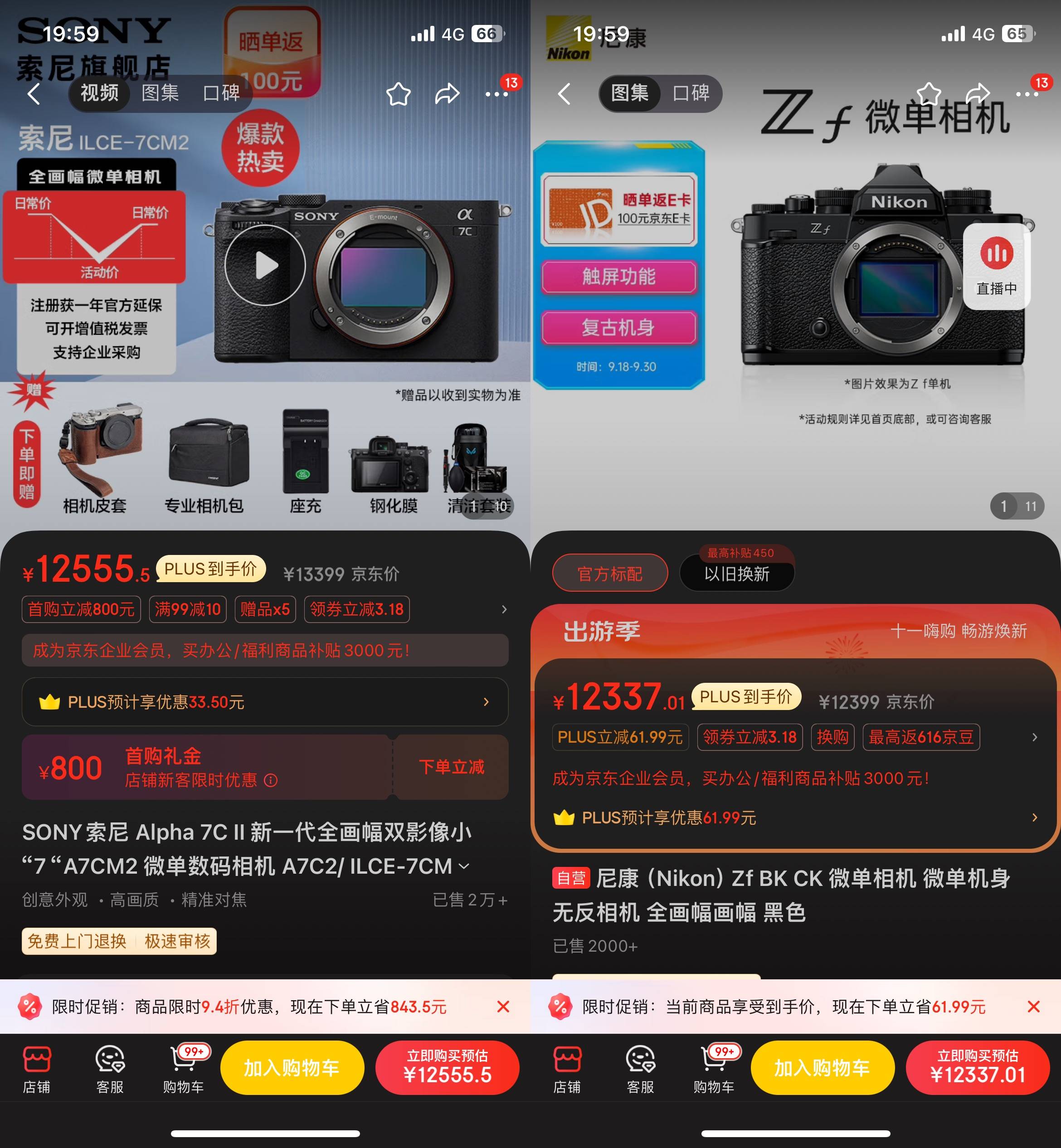 京东索尼A7C2和尼康Zf单机价格