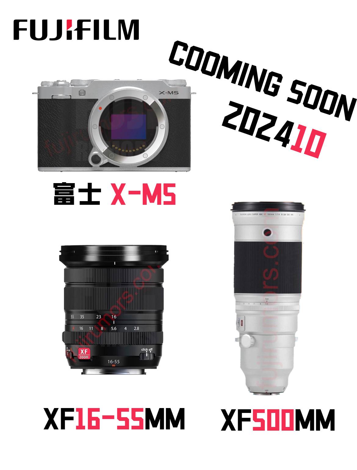 最后说说 XF 500mm f5.6 ,尺寸和 GF500 差不多,95mm的滤镜尺寸也和其一样。外观上和后者做出区分采用了白色,这个配色在富士相机上还是挺少见的 这三个器材目前官宣是10月14日一同发布,还是期待届时公布的价格吧,希望别和几个月前的X-T50一样给到惊吓 。。。