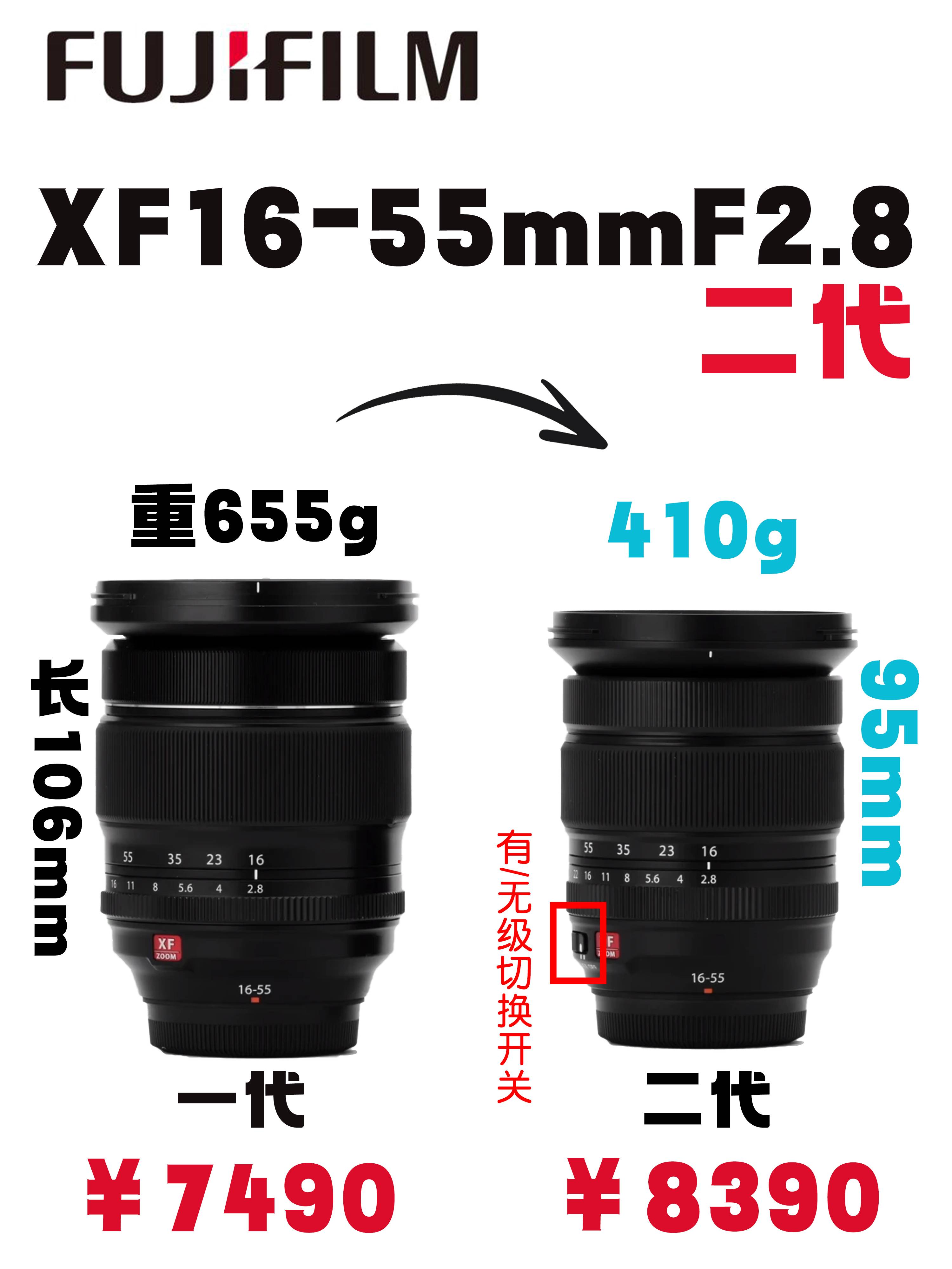 XF16-55mmF2.8 R LM WR II,在体积&重量上都比前代产品更加轻量化,多了一个有级/无级的开关(有/无级模式:有/无固定的光圈档位,如F4、F5.6)。今年各家的新品还是二代,都有着明显的轻量化产品设计思路特征,很明显这是各大厂商的