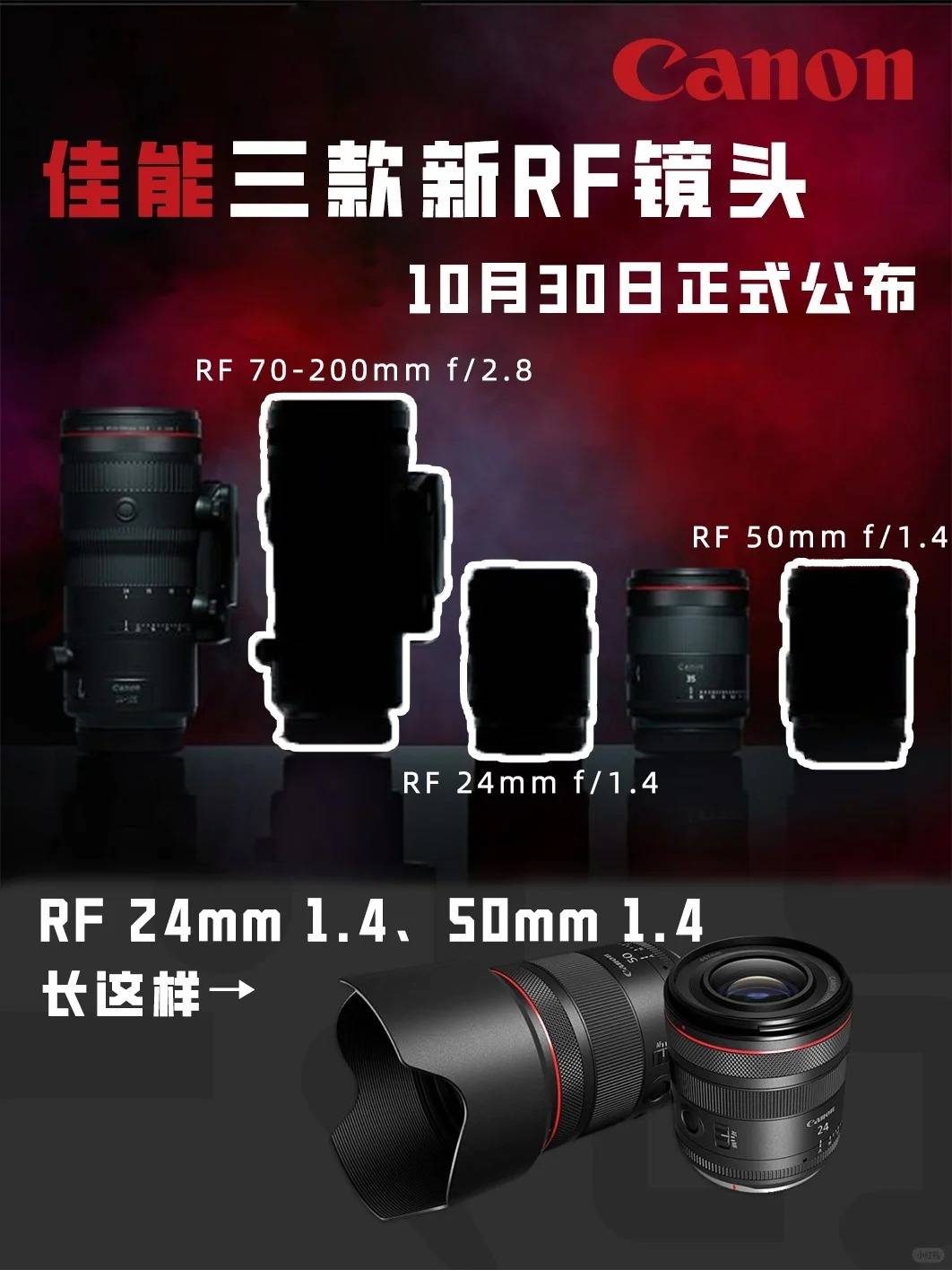 佳能海外官方在今日透露,即将在本月末发布的三款RF卡口的HYBRID镜头,分别是: RF 24mm f/1.4L VCM RF 50mm f/1.4L VCM RF 70-200mm f/2.8L IS USM Z 所谓 HYBRID 镜头,官方给出的定义是指兼顾拍照和视频的镜头,目前已有的是近一年内发布的 RF 24-105 f2.8 和 RF 35 1.4,两款镜头都具备无极光圈环和呼吸效应抑制,新镜头性能方面应该同样是参照两者