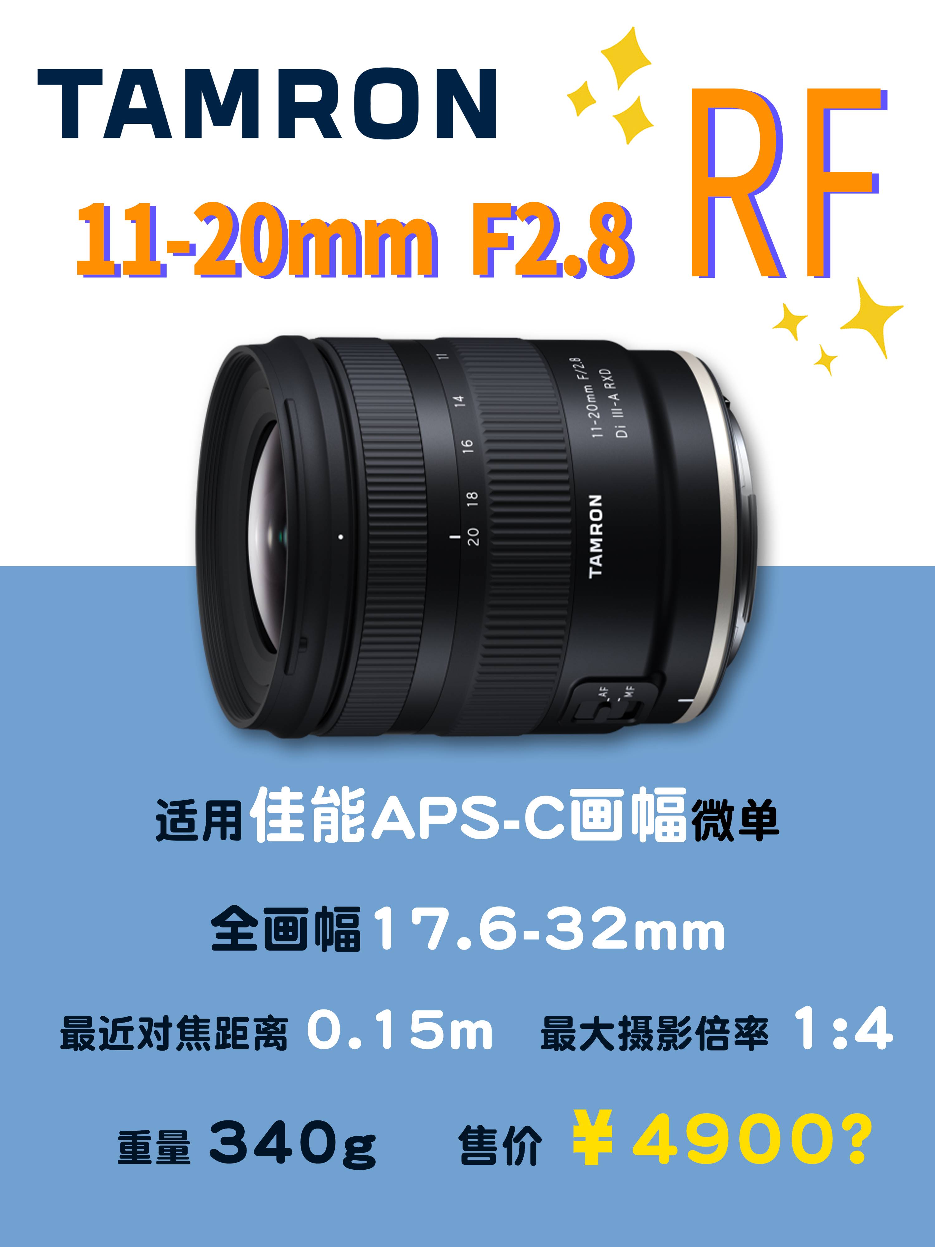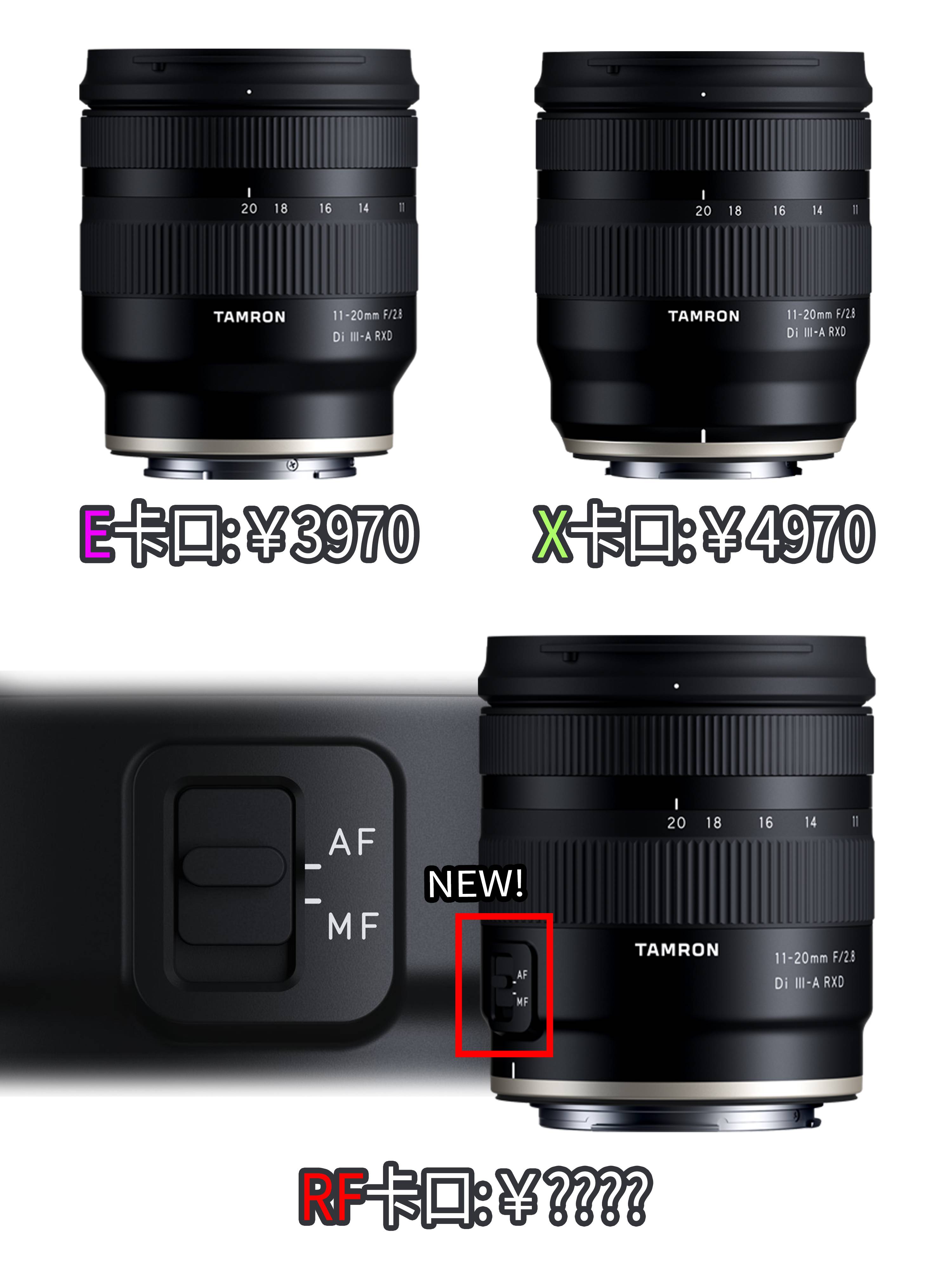 昨天腾龙发布了首款佳能RF卡口镜头11-20mm F/2.8 Di III-A※1RXD(型号 B060) 这是一款为APS-C画幅微单设计的,大光圈超广角变焦镜头,广角端具备一定微距能力。与21、23年发布的索尼、富士卡口版本相比,新增了一个自动/手动对焦的切换开关。是一颗很适合风光、建筑摄影的镜头 目前腾龙还未公布它的价格,大家可以大胆猜测一下,我先猜一手4900元