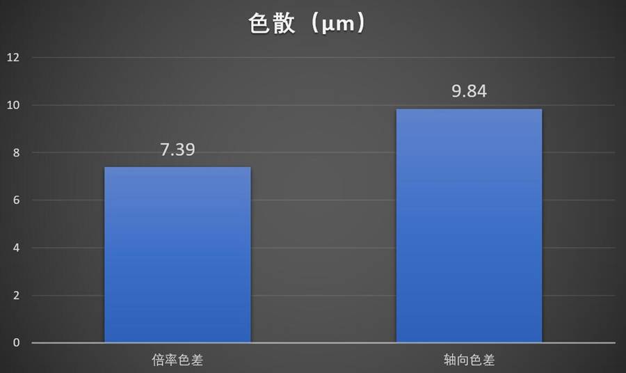 分为倍率色差(焦内色散)和轴向色差(焦外色散)两部分。计量各焦段下全画面色散的最大值,为其在像方焦平面(传感器平面)上的实际宽度。