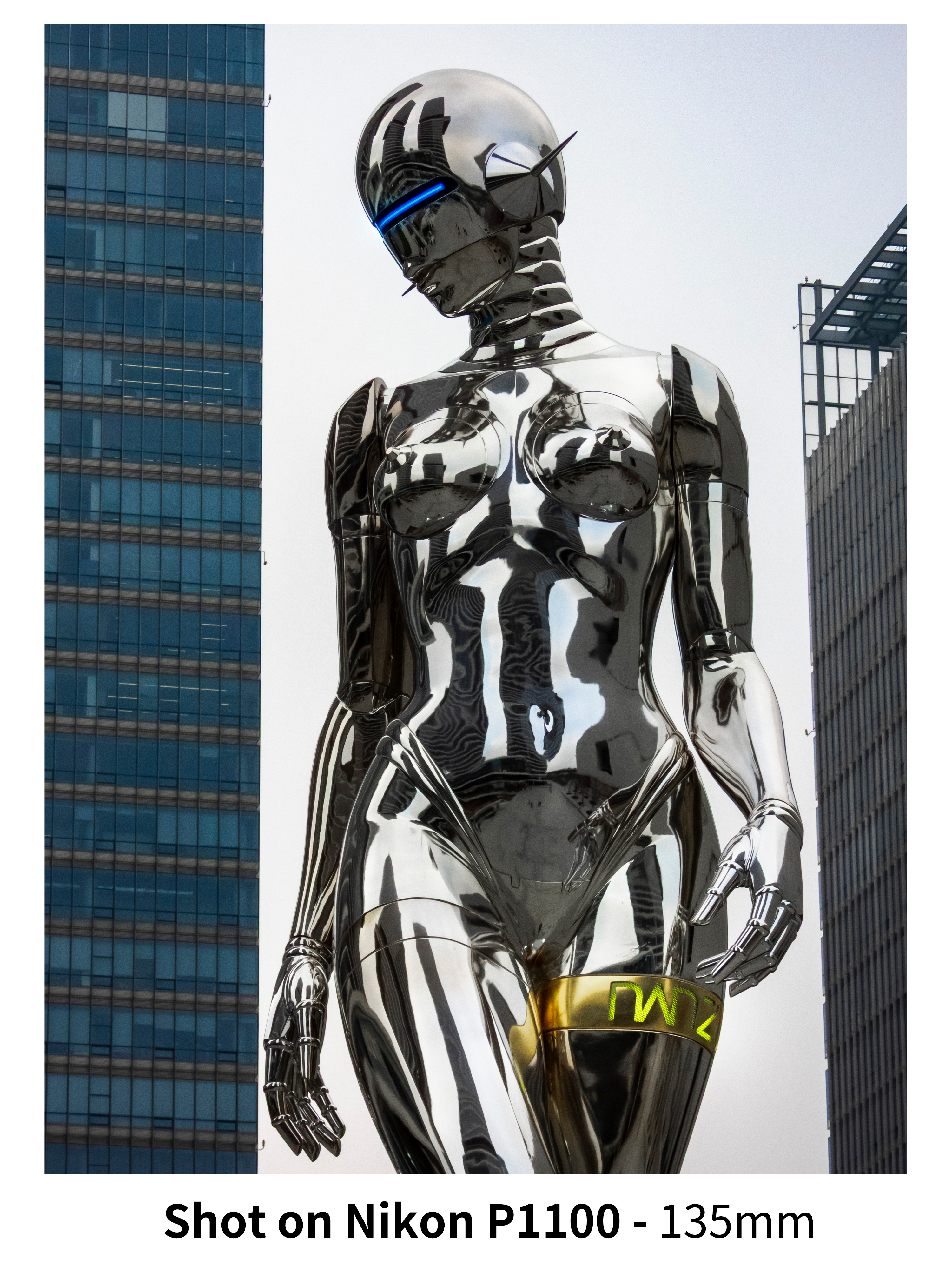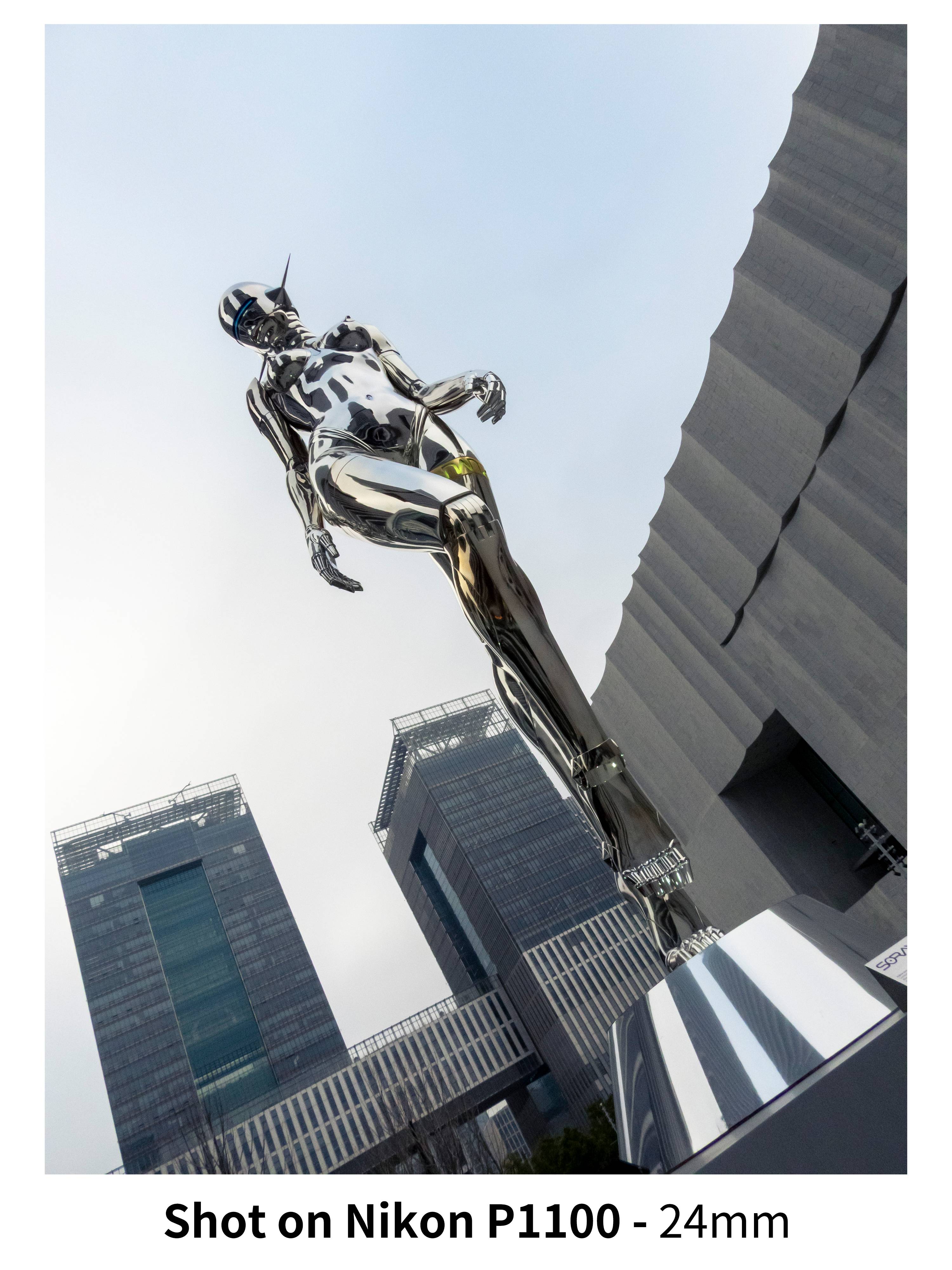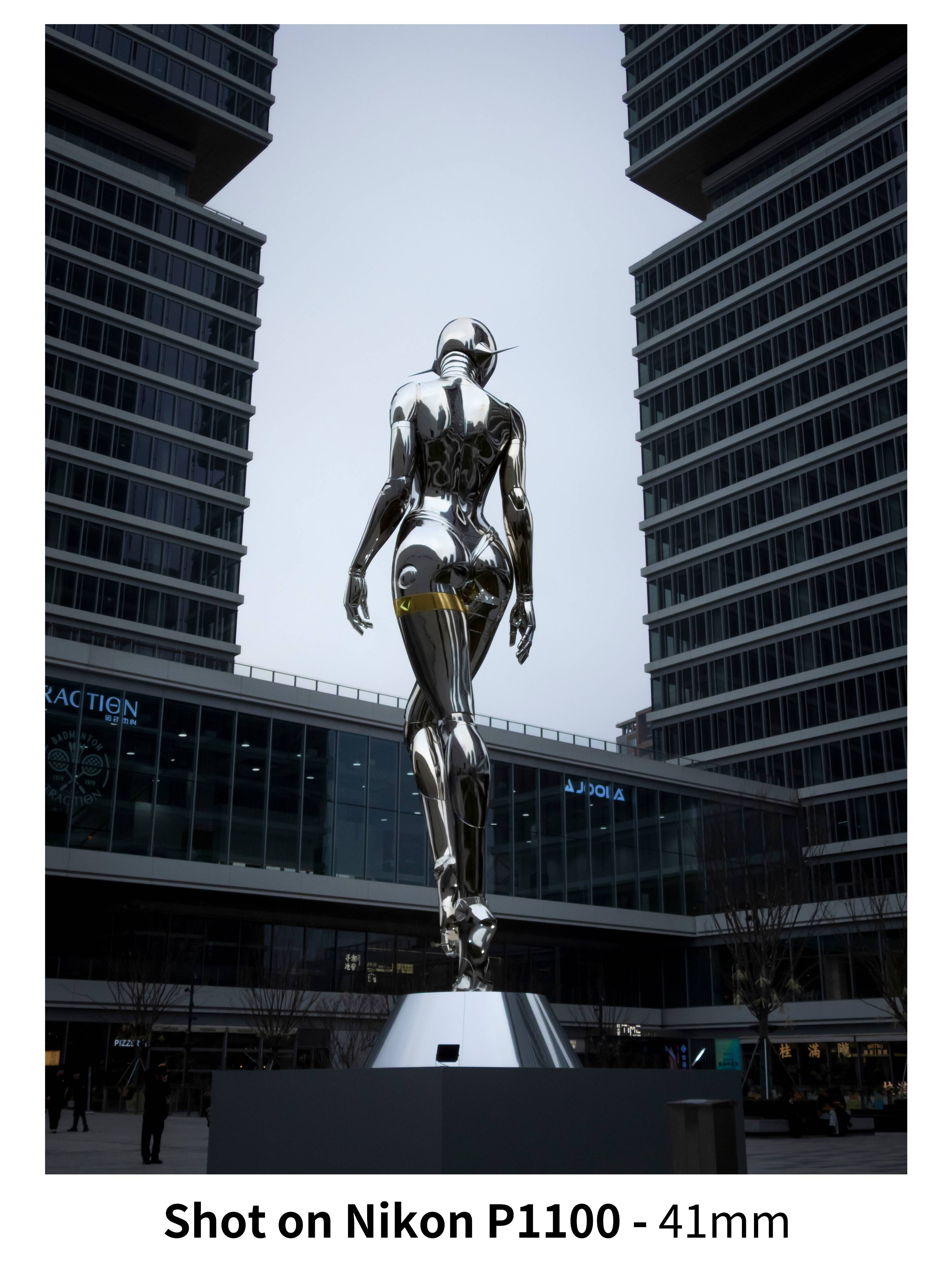 尼康P1100相机体积很大,重量相对较轻,拍摄手感一般。24-3000mm的光学变焦范围令人震撼,在这种广场/公园/景区等人多的场景,进可广角表现张力,退可长焦压缩背景,构图非常方便 变焦范围展示 画质上,1/2.3英寸的底确实会有一定影响,但拍摄raw格式,后期空间足够,来看看成片效果如何~ 巨型机械姬是艺术家空山基的作品,雕塑周围是现代化建筑,晴天/黄昏/夜景都很出片 位置:上博东馆后方(上海科技馆地铁站步行10分钟)