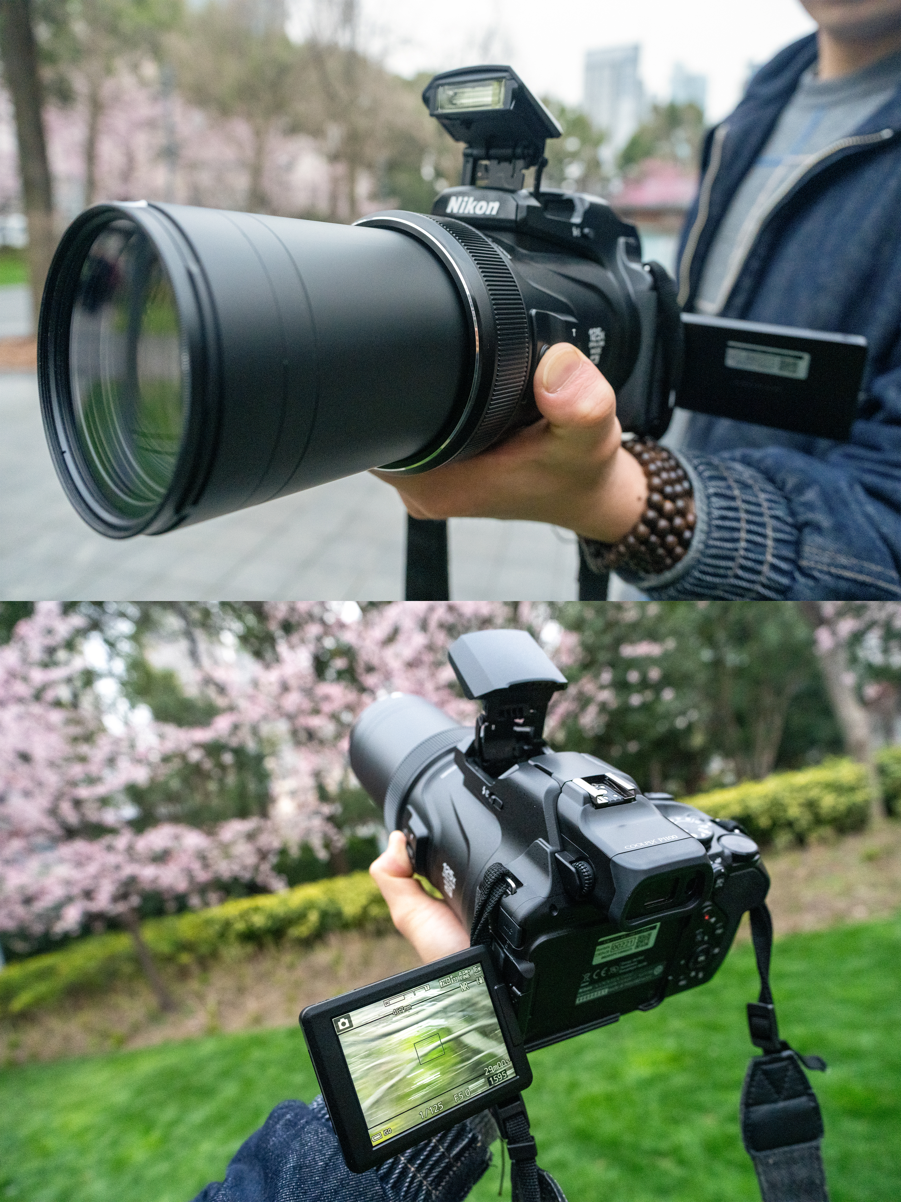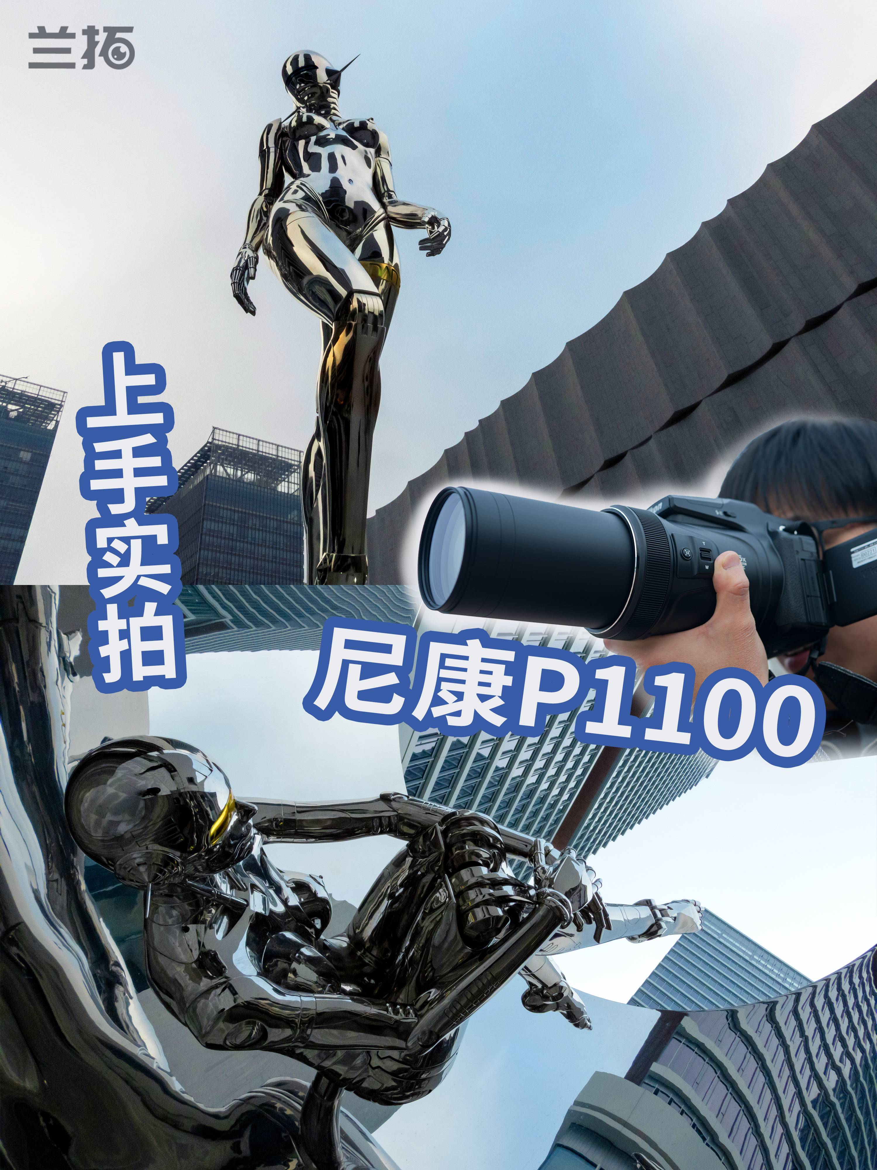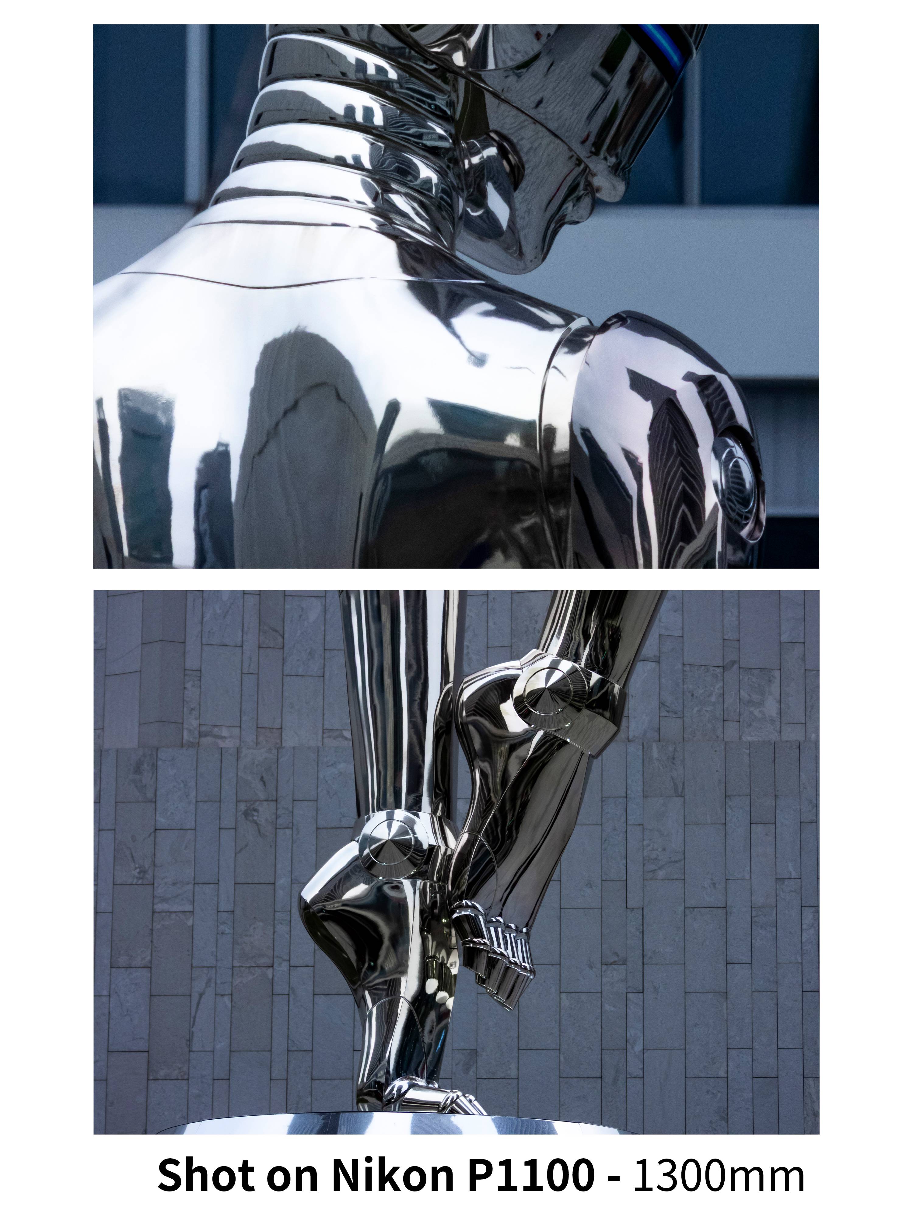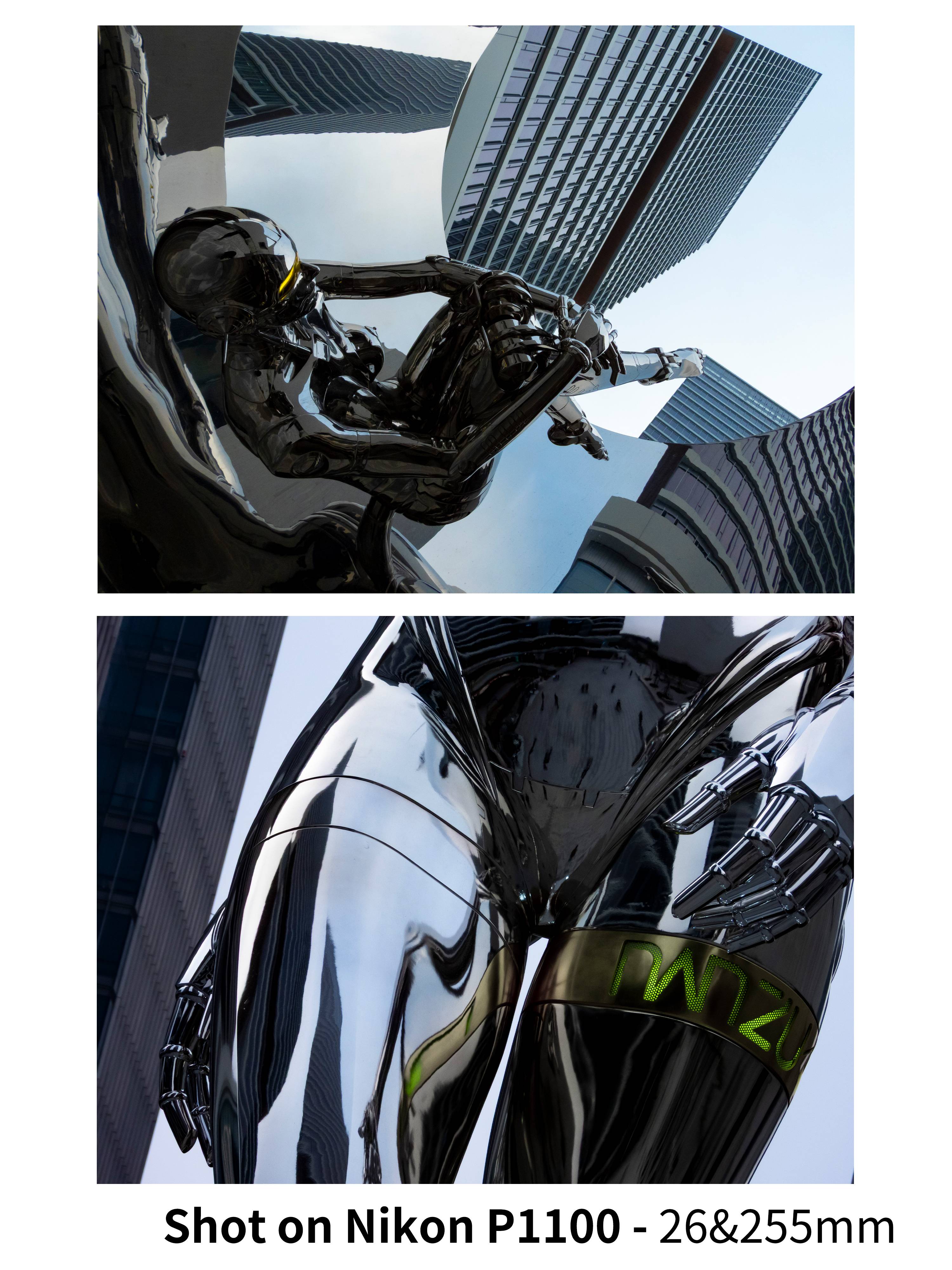 尼康P1100相机体积很大,重量相对较轻,拍摄手感一般。24-3000mm的光学变焦范围令人震撼,在这种广场/公园/景区等人多的场景,进可广角表现张力,退可长焦压缩背景,构图非常方便 变焦范围展示 画质上,1/2.3英寸的底确实会有一定影响,但拍摄raw格式,后期空间足够,来看看成片效果如何~ 巨型机械姬是艺术家空山基的作品,雕塑周围是现代化建筑,晴天/黄昏/夜景都很出片 位置:上博东馆后方(上海科技馆地铁站步行10分钟)