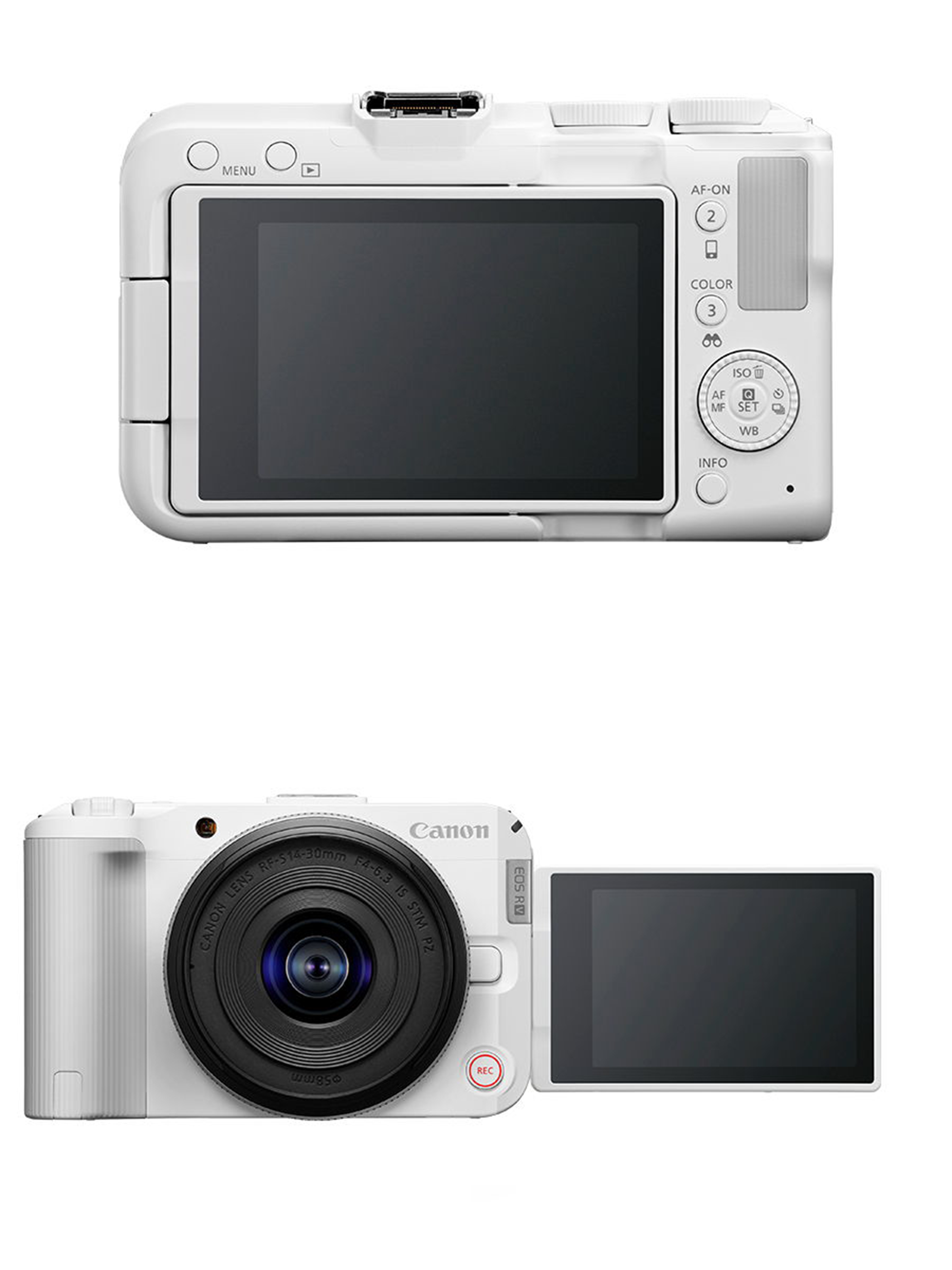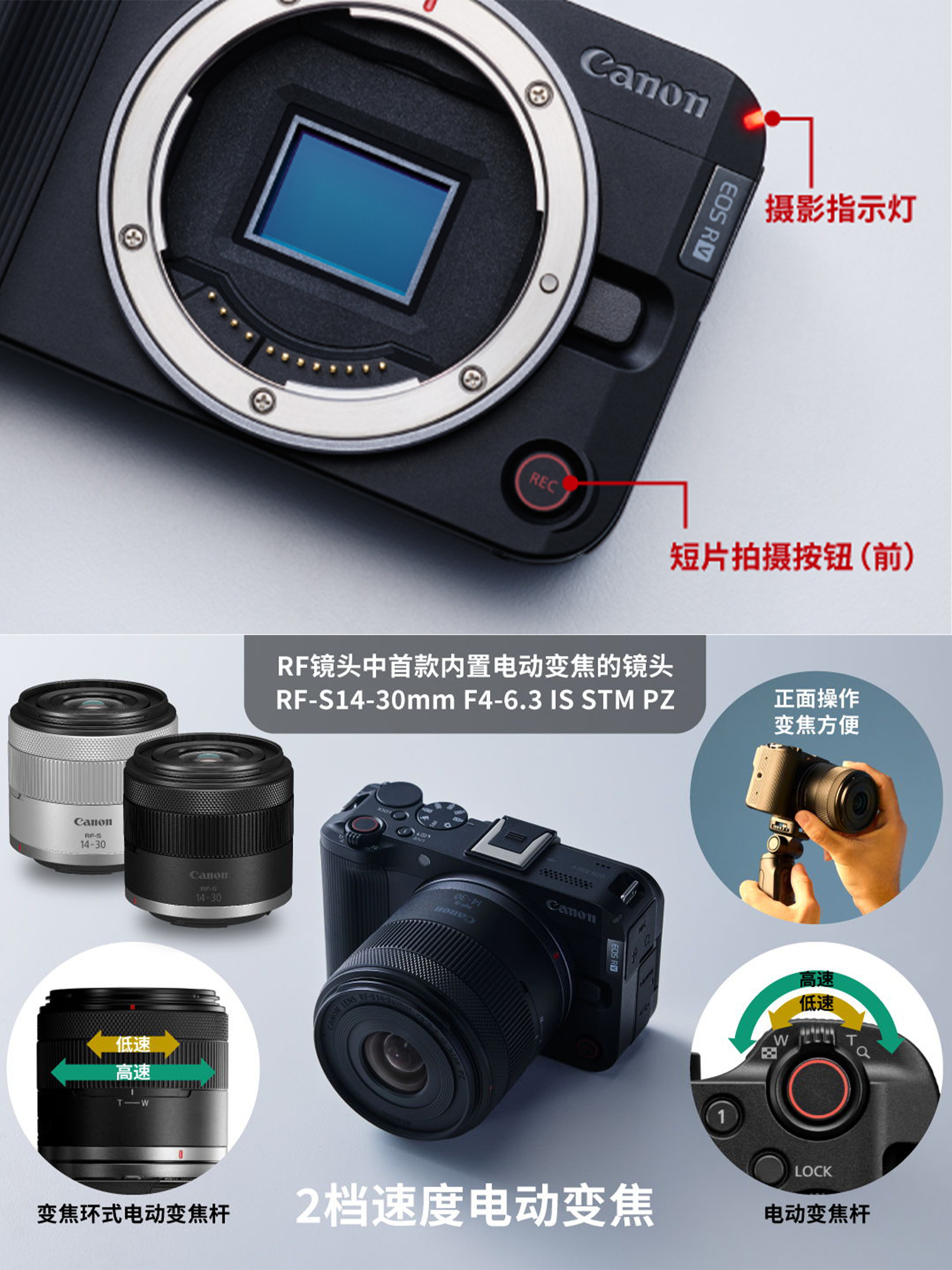 R50V的主要参数与R50无异,重点优化了视频性能和操作性。前侧设计了录像指示灯和额外录像按钮,且电动变焦(搭配套头)、10bit 422、4K60P、C-Log3也安排上了。右侧另增加一个螺口,可接三脚架,更适配竖屏时代的拍摄需求。
