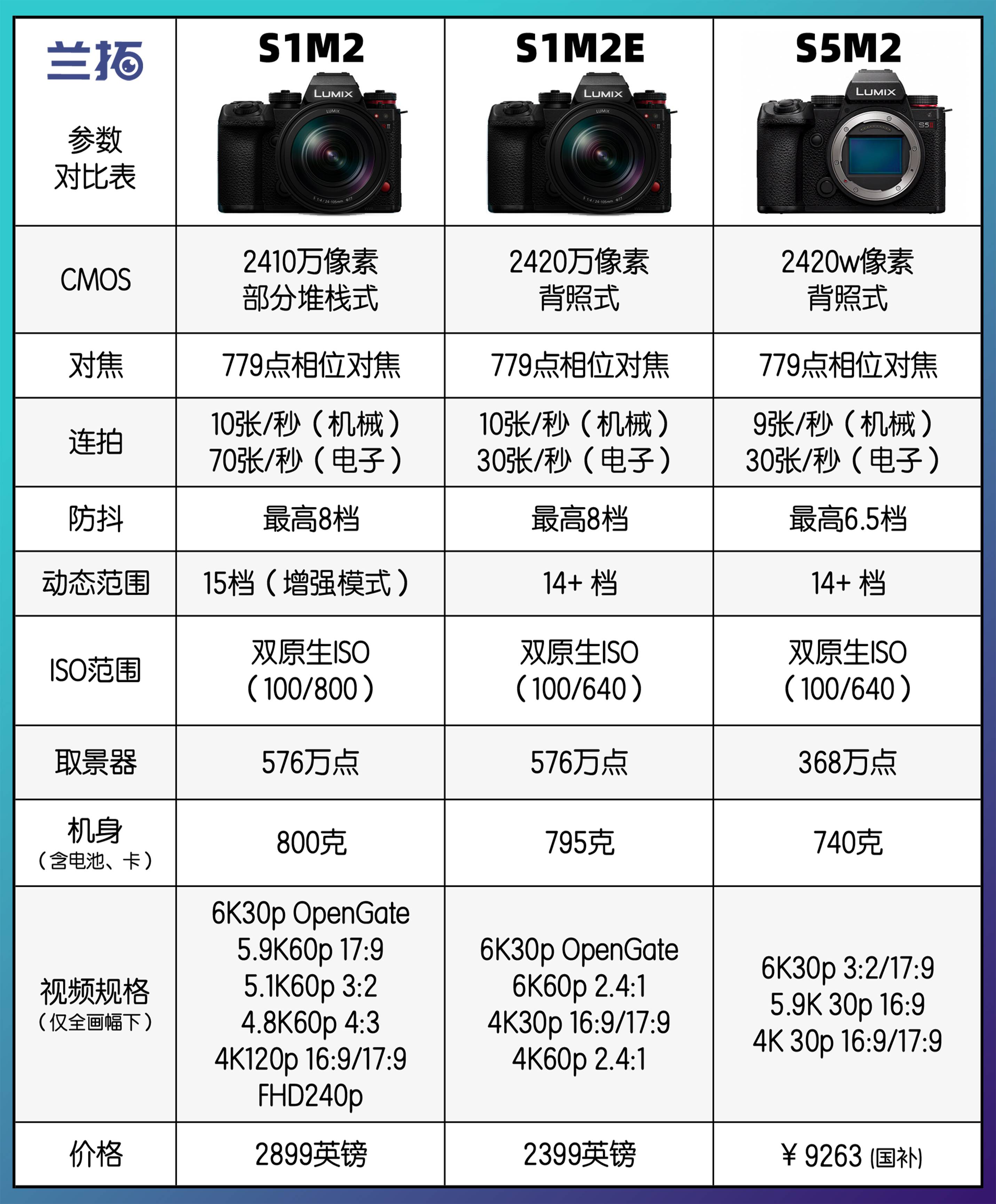 【S1M2E】则可以理解为小减配版或“S5M2高配版”,在连拍、动态范围、视频规格等方面略施刀法,CMOS是S52同款(IMX410)