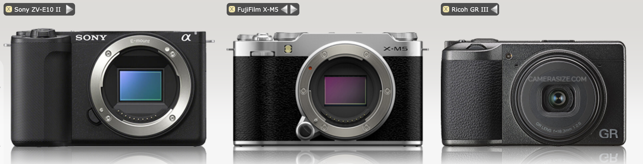直接上图,可以看到X-M5比ZV-E10还要略小,延续了富士微单的复古造型。不过单纯比体积,还是完全没法和GR3比较的。