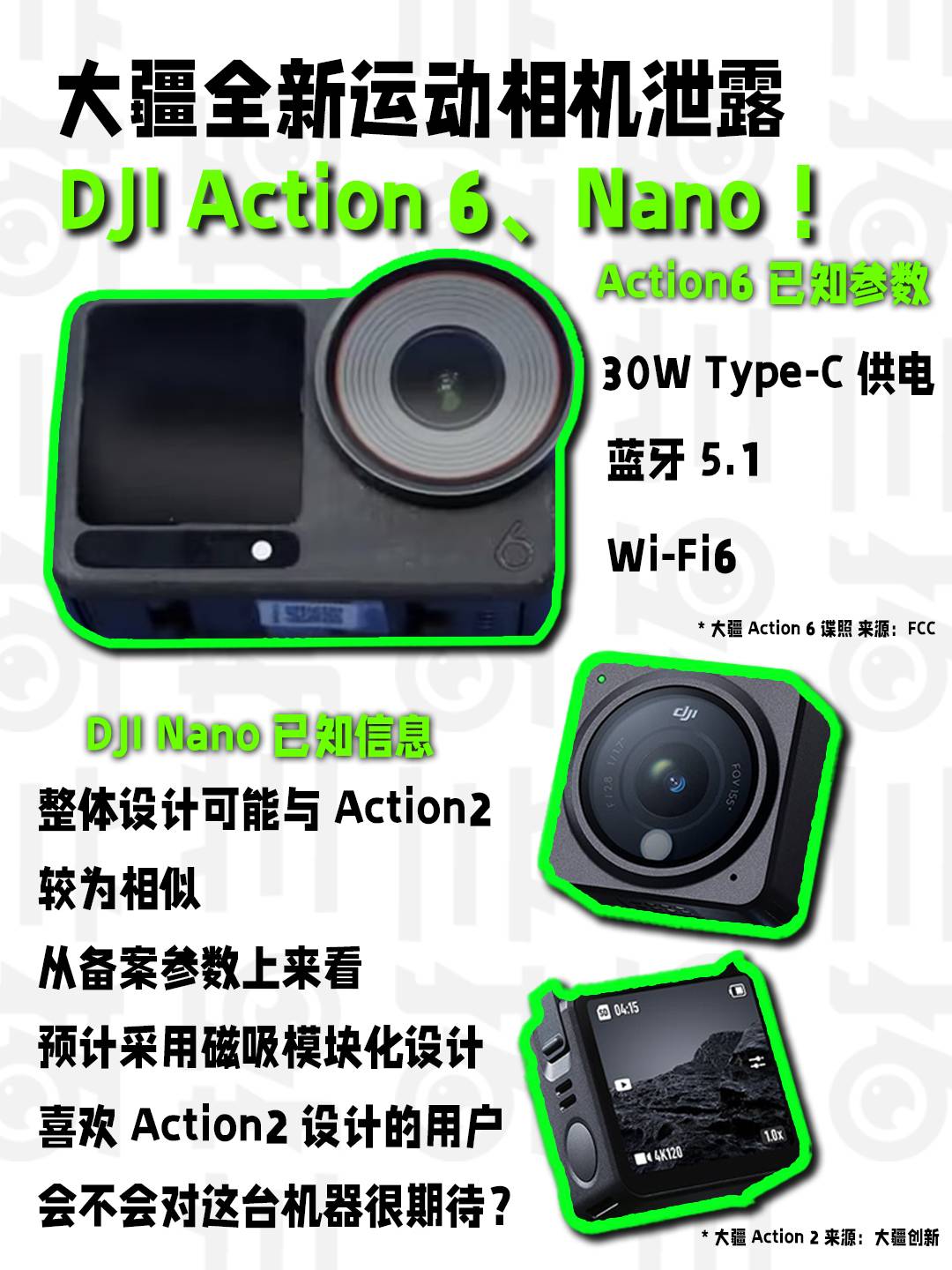 近期,大疆Action6的工程样机谍照是满天飞啊,虽然造型可能与最终发布有所差异,但是具体结构布局应该不会有太大改变,大疆Action6或将在今年10月份左右的发布会上推出,同时还有大疆新序列Nano,目前从申报规格上来看,可能与Action2代较为相似,同时采用模块化结构与无线图像传输。大疆创新最近的产品可谓是诚意十足,每一次新品在技术、设计、影像等多维度上都有着不小的突破。