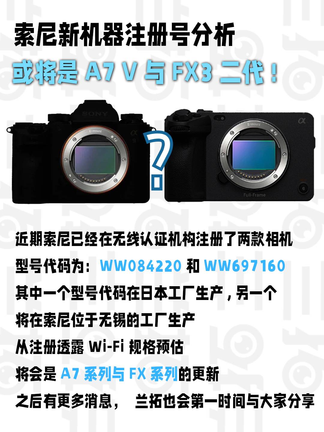 索尼最近也是新品接连推出,近期索尼在无线认证机构上注册了两款相机,按照以往经验大致将在3到6个月内进行发布,型号代码为:WW084220 和 WW697160。具体来说,其中一个型号代码在日本的工厂生产,另一个将会在无锡工厂生产。从现有注册规格结合产品更新序列,预估将会是FX3二代和A7 V的更新。后续有更为详尽的信息,兰拓也会第一时间与大家进行分享。
