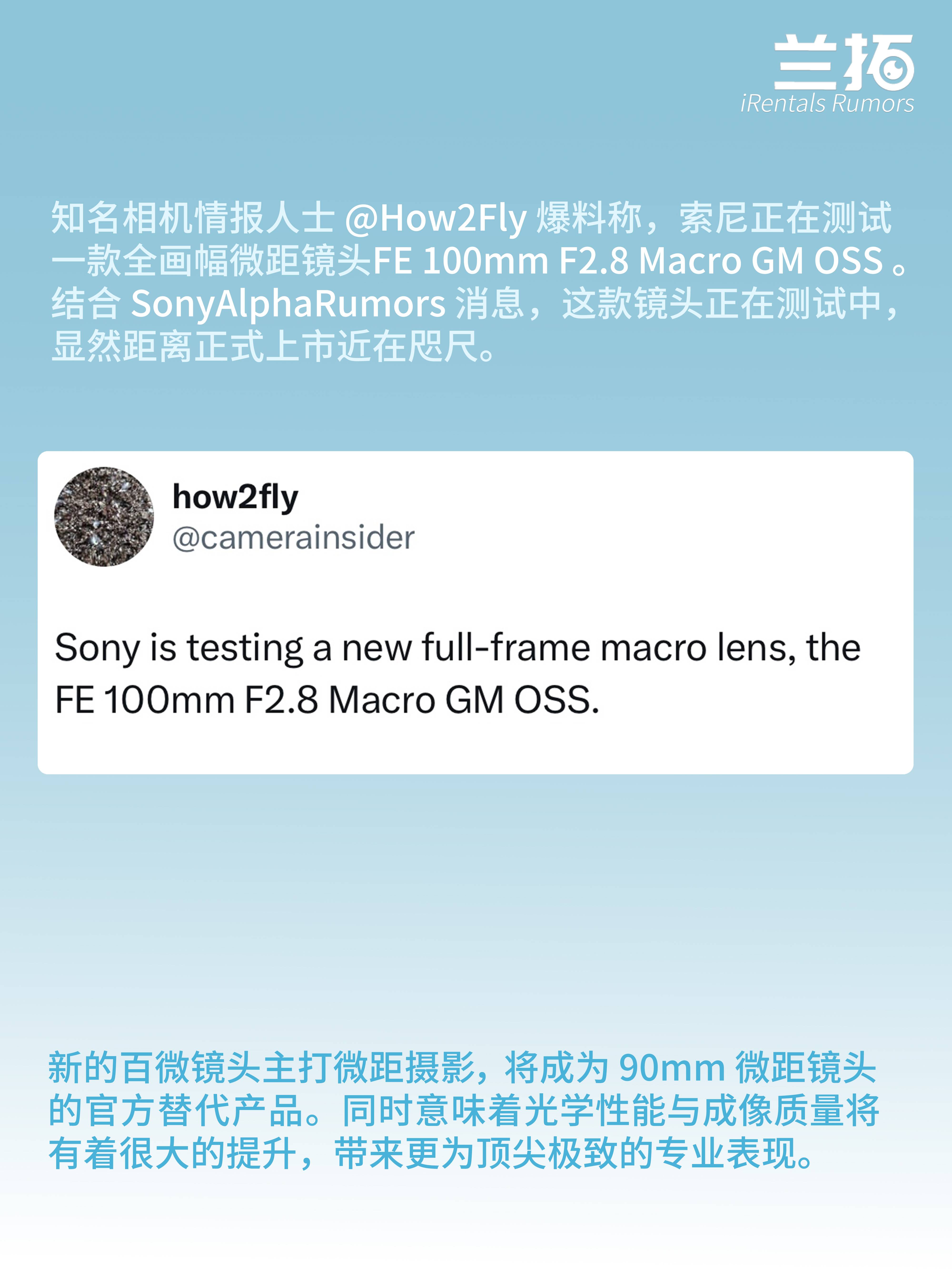 前几天,知名相机情报人士@How2Fly爆料称,索尼正在测试一款新品全画幅微距镜头FE 100mm F2.8 Macro GM OSS,取代近十年的老将FE 90mm F2.8 Macro。说实话,这支90微的画质放到现在依然能打。但毕竟是索尼早期的镜头,它的对焦速度和高像素需求,相比较现在的G大师镜头比起来,确实有一点跟不上时代。