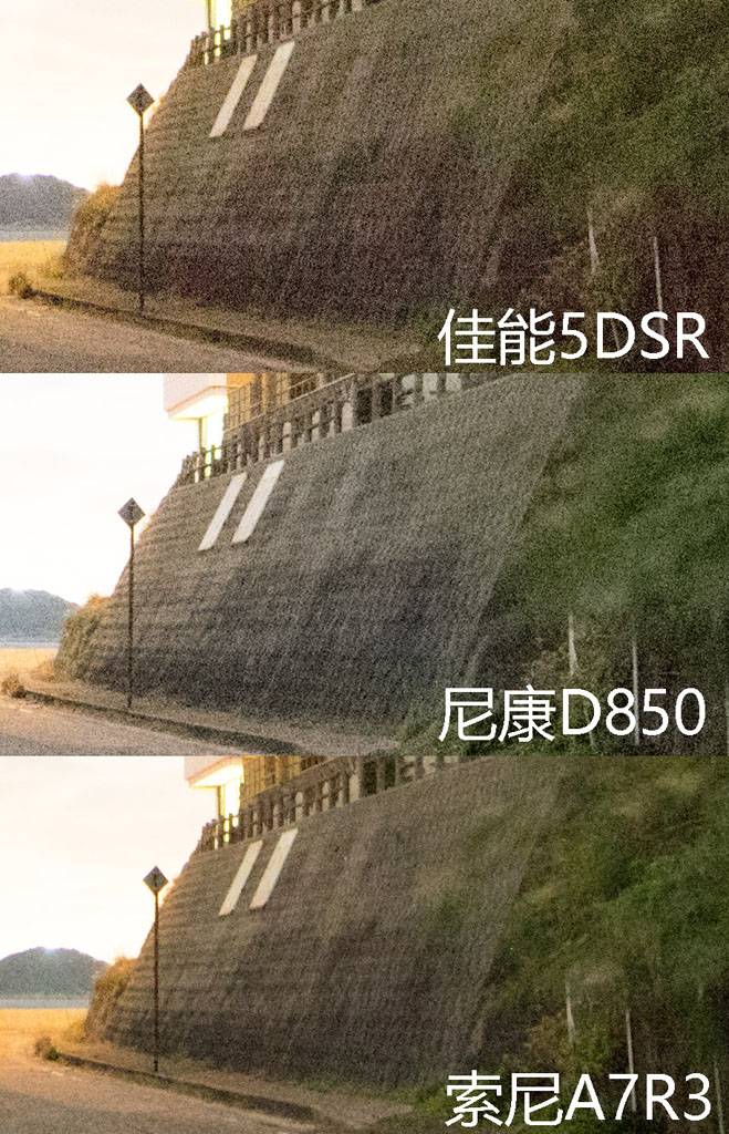 可以明显看到A7R3和D850的高感相差不多,即使有差距也是伯仲之间,可以认为是“≈”。相比而言就算是缩了图,5DSR的高感跟它们相比也是一眼就能看出的差距。