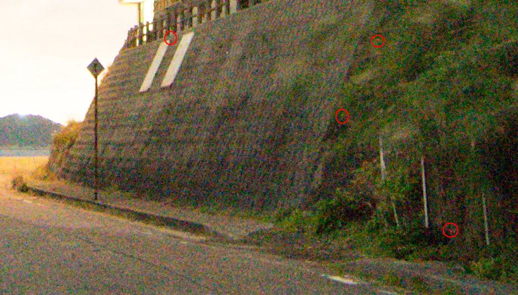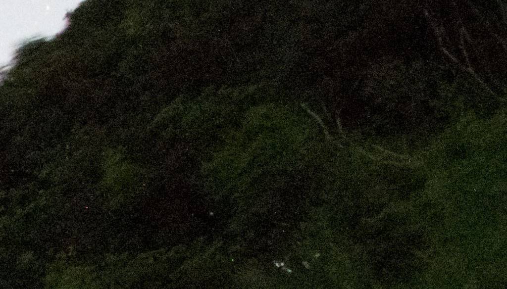 如同之前微博上翻拍屏幕时看到的一般。但只要把彩色降噪还原到默认的25,这些彩噪立即消失不见,剩下一些无伤大雅的白点点。(下面那一片是树叶缝隙透光,别看错了)