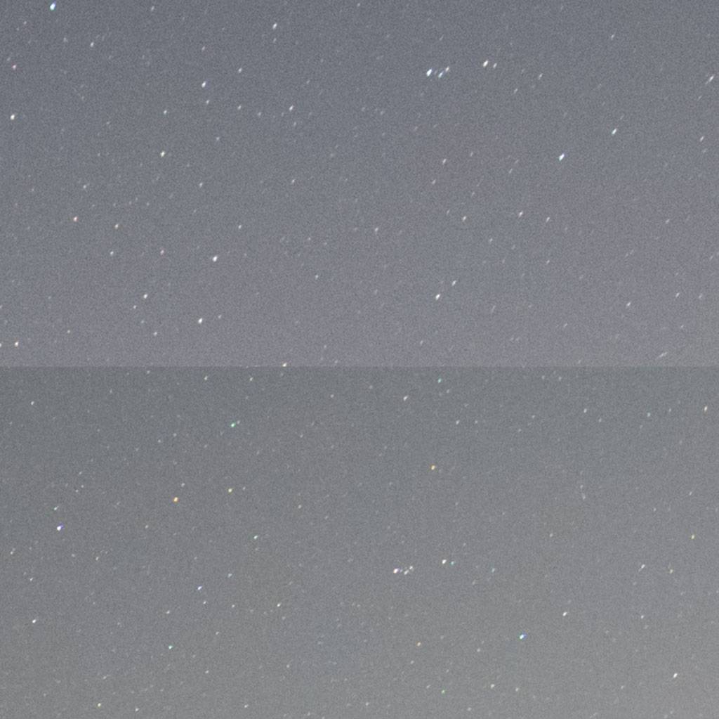我也不说哪个是哪个,大家自行判断(有没有区别)吧。反正我的观点就是:就算是拿放大镜能找出来的少了那么一两颗被降噪误杀的星,对你拍个银河星野也没毛线影响,还不如你镜头对焦歪一点影响大。真正拍深空的,也不会直接拿这两部机不改机就去拍。所以,没什么所谓。