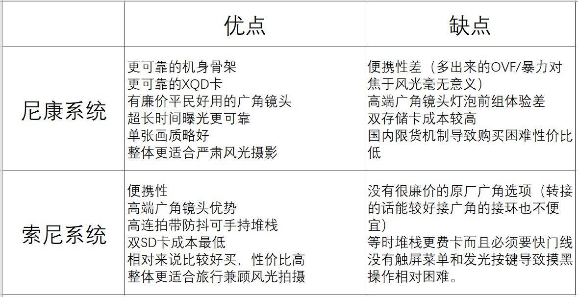 结论:从出发前准备的角度而言,索尼是最方便的,佳能次之,可以看情况决定,尼康最差,要带的杂七杂八东西最多。
