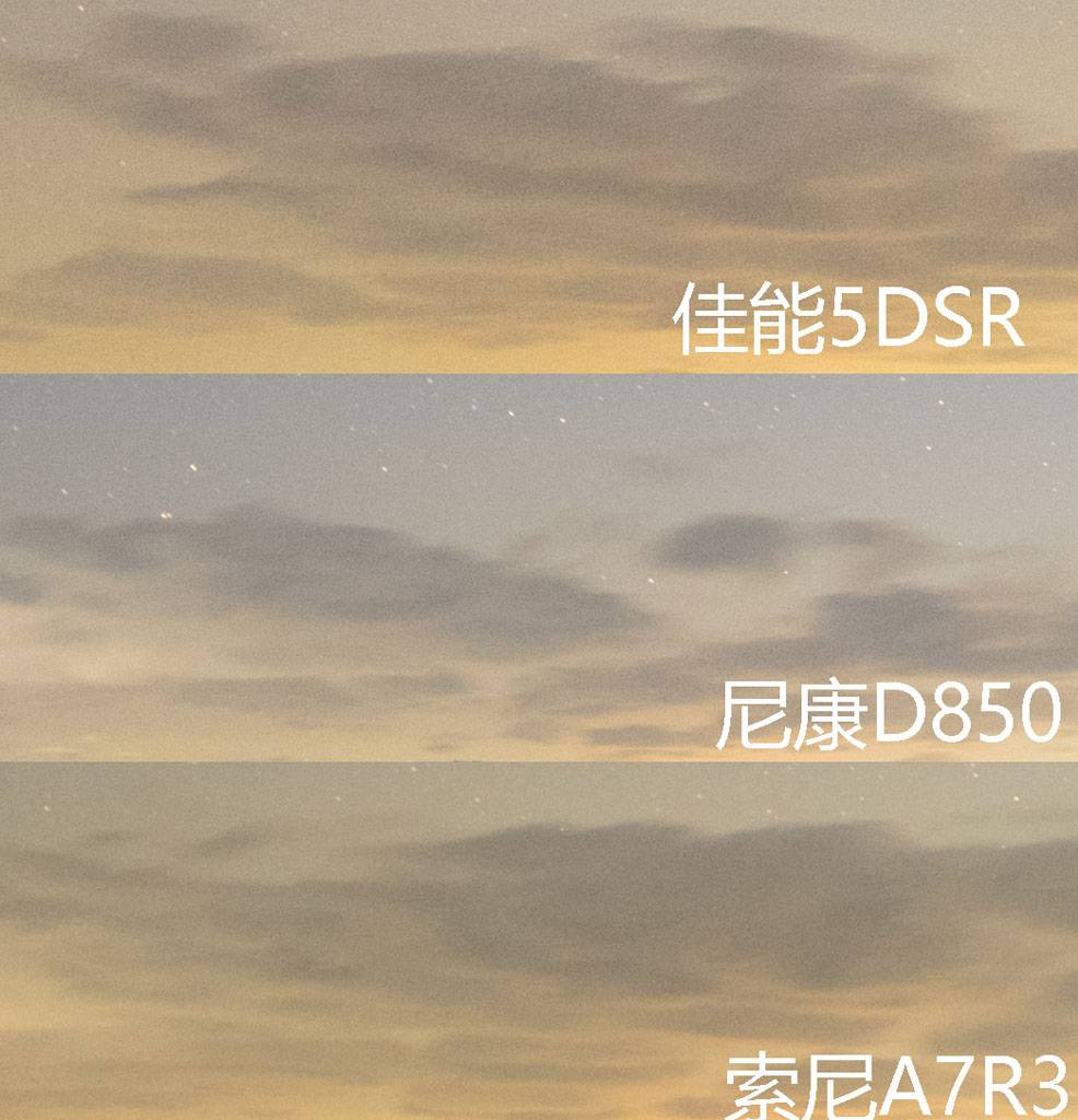 三台相机的白平衡倾向都不太一样。下面我们来对比一下它们拍星空时的高感画质。由于这三部机器设为ISO3200时的真实ISO都不一样,我们后期尽量把它们调整到相同亮度进行比较。
