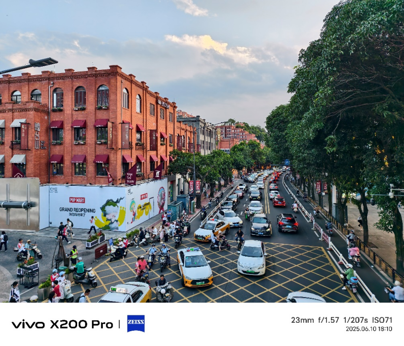 尽管主摄传感器从1英寸缩至1/1.28英寸,但在逆光场景下动态范围表现依然优秀。实拍中,日落时分的高光云层与暗部建筑细节均清晰可见,噪点控制优于多数竞品。配合蔡司自然色彩算法,人像肤色还原真实且光影过渡柔和。vivo还将夜景、星空、慢门等多个模式融合为风光模式,依靠AI智能判断场景,大幅降低了专业摄影的门槛