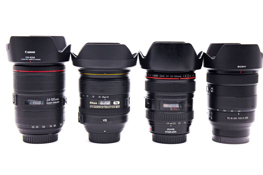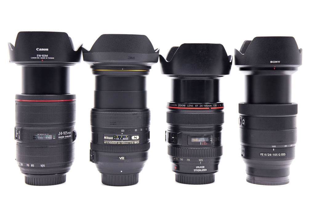 先来看看它们的外观,从左到右分别是佳能EF 24-105mm f/4L IS II USM(以下简称24-105L II)、尼康AF-s 24-120mm f/4G ED VR(以下简称24-120G)、佳能EF 24-105mm f/4L IS USM(以下简称24-105L)、索尼FE 24-105mm f/4G OSS(以下简称24-105G)。可以看到除了佳能的24-105L II体积稍大之外,另外三支镜头的携带体积(收折之后的长度)基本是一样的。