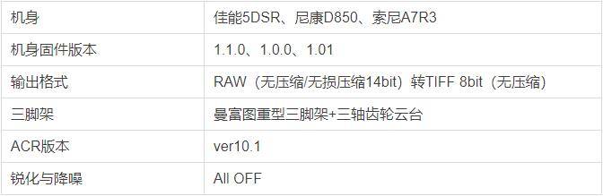 由于尼康D850(4575万像素)已发布,CNS三家像素机的像素数量差距变得不那么大,因此镜头测试改用三家原生卡口(5DsR、D850、A7R2)进行测试,这三台机器搭配镜头由于像素造成的分辨率差距不会超过8%,对于镜头画质的定性几乎无影响,同时可以避免转接带来的各种问题。